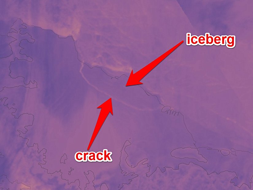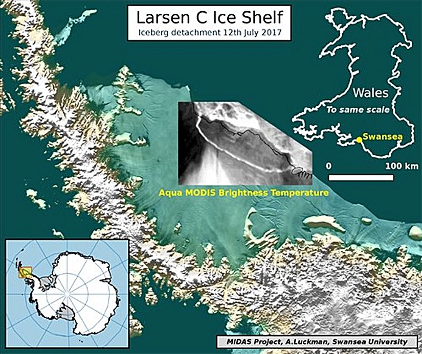 Science AlertAşağıdaki fotoğraf ise MODIS tarafından 12 Temmuz günü çekilen Larsen C Ice Shelf ve kopan buzdağının termal bir görüntüsü. Önceden çekilmiş uydu fotoğraflarıyla karşılaştırılınca, bu buzdağının en büyük 3. buzdağı olduğu söylenebilir.