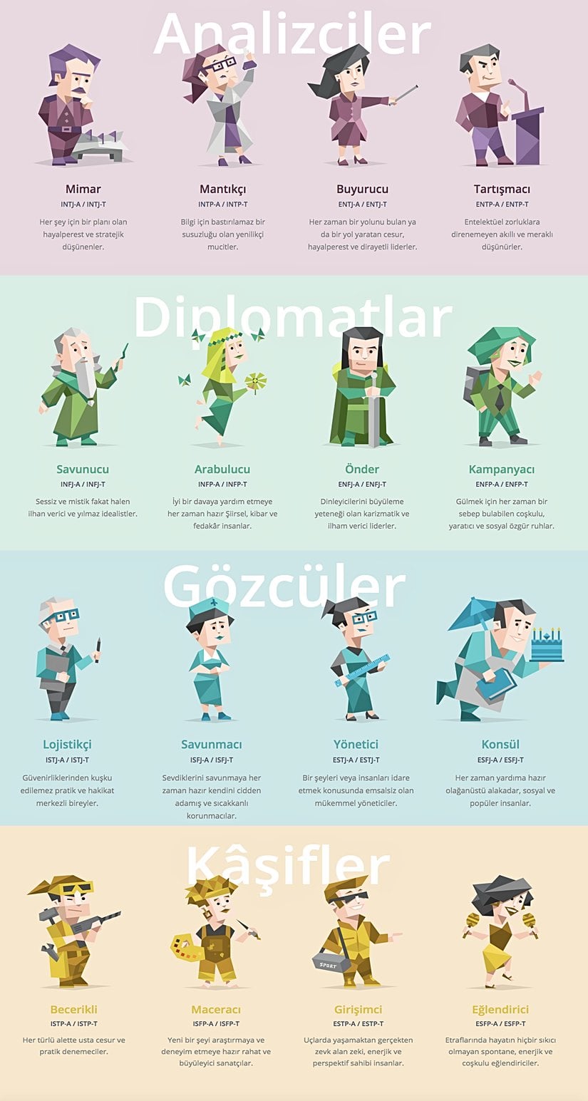 Testin sonucunda 16 farklı kişilik grubundan birine yerleştiriliyorsunuz. Bu 16 grubun da havalı isimleri var; ISTP-A, ENFJ-T gibi... Bu harflerin anlamlarına yazının ilerleyen kısımlarında geleceğiz; ancak harfleri söylemek zor gelmesin diye, daha kolay isimler de verilmiş; mantıkçı, buyurucu, savunucu, konsül, lojistikçi gibi: