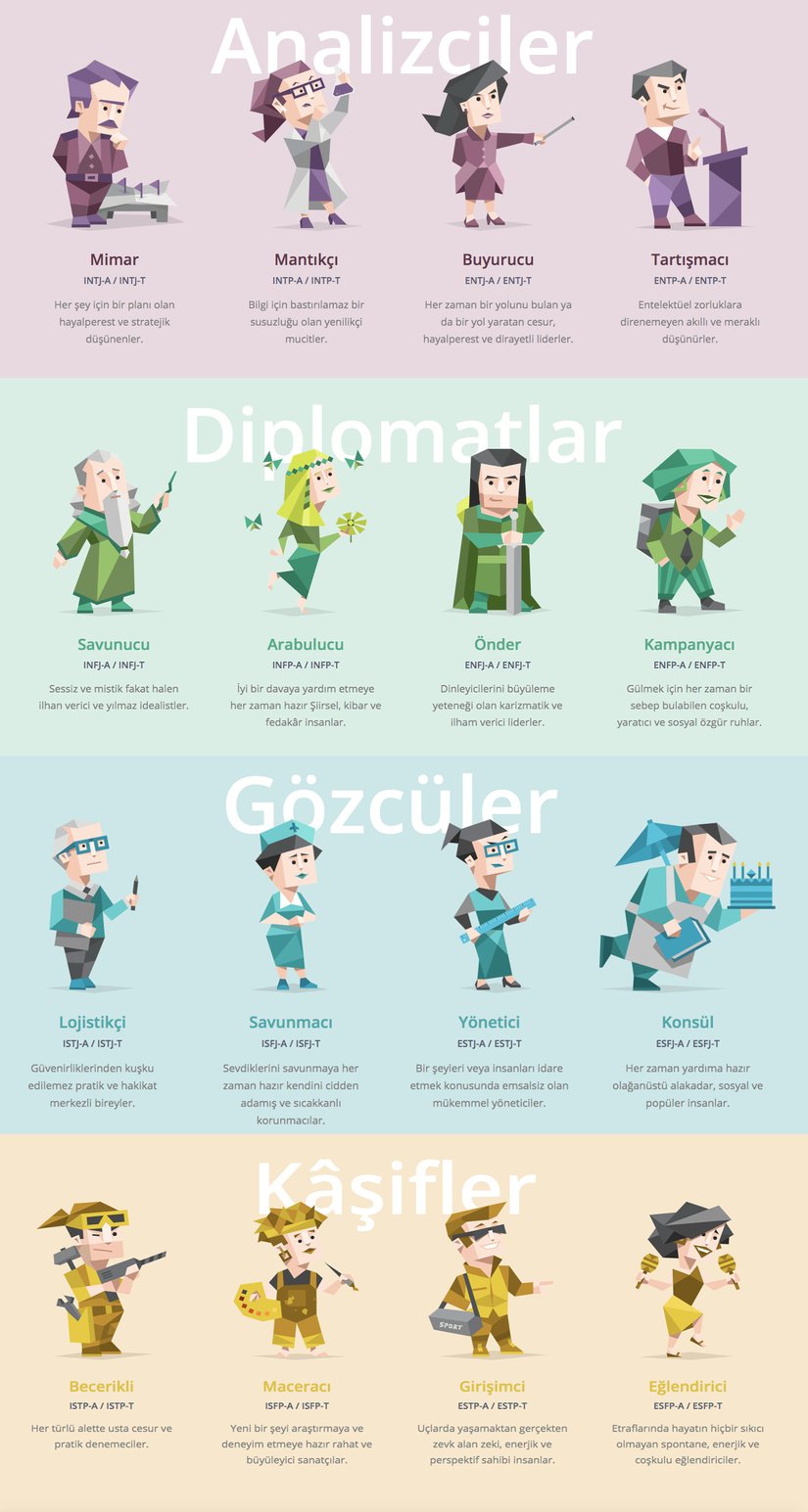 Testin sonucunda 16 farklı kişilik grubundan birine yerleştiriliyorsunuz. Bu 16 grubun da havalı isimleri var; ISTP-A, ENFJ-T gibi... Bu harflerin anlamlarına yazının ilerleyen kısımlarında geleceğiz; ancak harfleri söylemek zor gelmesin diye, daha kolay isimler de verilmiş; mantıkçı, buyurucu, savunucu, konsül, lojistikçi gibi: