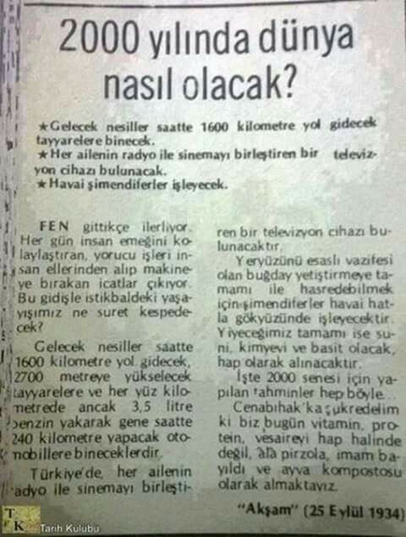 Bilimkurgu Kulübü'nün paylaştığı bu gazete küpürü bizi düşündürdü: Akşam Gazetesi'nin 1934 tarihli bu yazısı, 2000 yılını (veya genel olarak "2000'li yılları") ne kadar yansıtıyor?