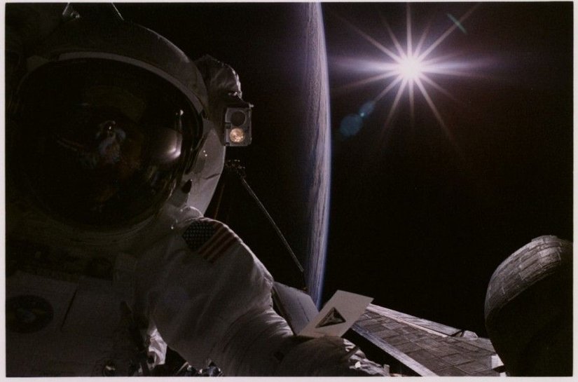 Aslında bu ikincisi tam olarak bir "selfie" sayılmaz, çünkü fotoğrafı çeken kişi astronot Harbaurgh. Ama yine de mesafeden ötürü epey benziyor son zamanların modası selfielere... Fotoğrafta ayrıca Discovery uzay aracının bir kısmı ve gezegenimizin bir kısmı gözüküyor.