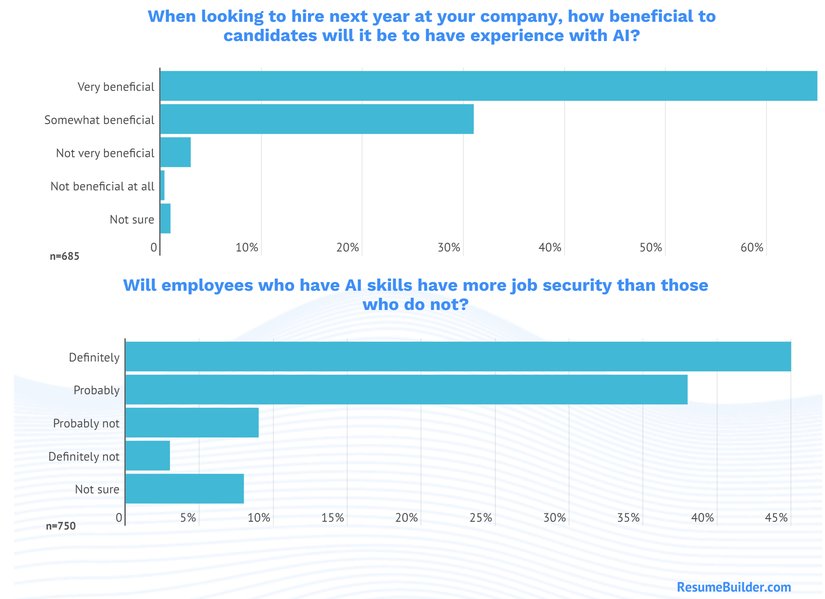 Yapay zeka kullanan veya 2024'te kullanmaya başlamayı planlayan şirketlerin %91'i 2024'te yeni çalışanlar işe alacak ve %96'sı adayların yapay zeka konusunda deneyim sahibi olmasının çok (%65) veya biraz (%31) faydalı olacağını söylüyor.