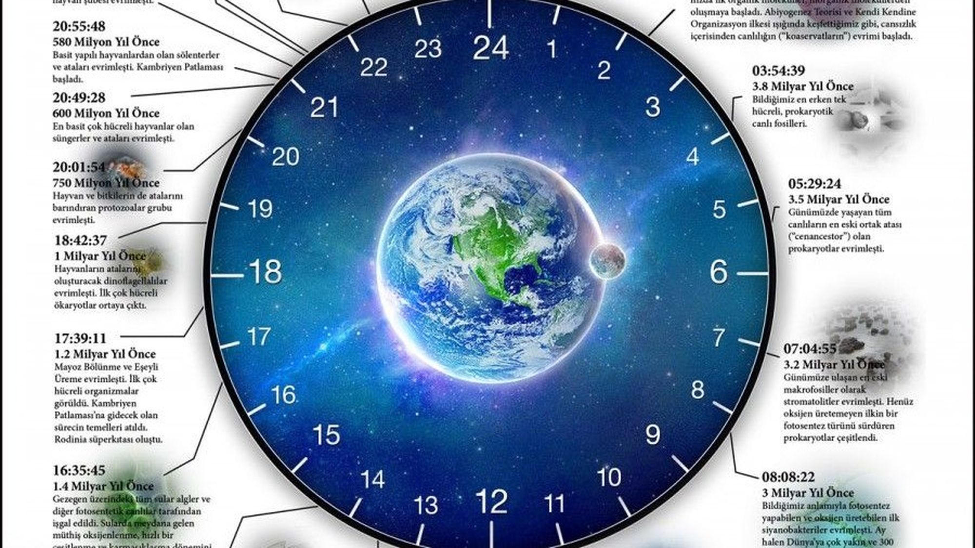 Dünya'nın 4.54 milyar yıllık tarihini 24 saate sığdıracak olursak karşımıza böyle bir tablo çıkıyor. Kaldı ki sığdırdıklarımız, aslında yazılabilecek "önemli" olayların bile %1'i dahi değil; eğer ki kaynaklarımızdaki 2 yazımızı okursanız görebilrisiniz. Ancak olabildiğince fazla ve kritik bilgiyi, olabildiğince etkili şekilde vermeye çalıştık.