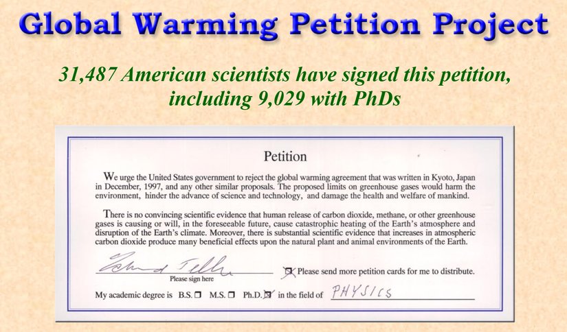 30.000 küsür bilim insanının insan kaynaklı iklim krizinin sahte/yalan olduğunu iddia ettiği, bu bilim insanlarının bilim camiasındaki görüş birliğinden ayrıldığı iddiası herhangi geçerli bir temele dayanmamaktadır. Söz konusu metne imza atan kişilerin ezici çoğunluğu bilim insanı değildir; "bilim insanı" unvanını hak edenlerin de çoğu mühendistir, iklimbilimci değil. Ayrıca imzacılar arasında "Charles Darwin", "Spice Girls" ve Star Wars karakterleri gibi sahte imzalar yer almaktadır.[1] Yani söz konusu dilekçeyi imzalayanlar, bilim cemiyetine karşılık gelen bir demografiyi yansıtmamaktadır.