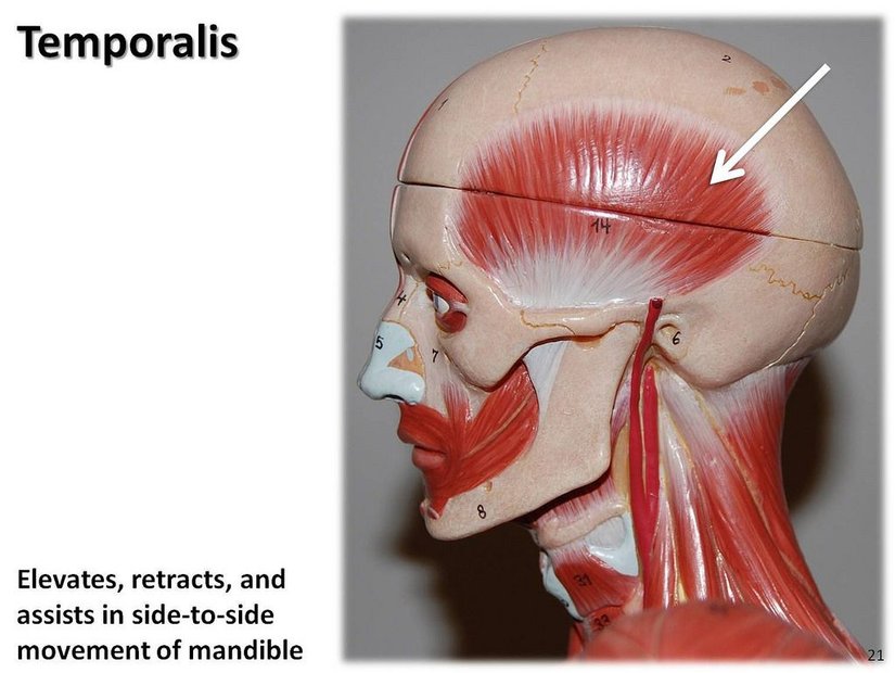 Kafamızın her iki yanında, şakaklarda (temporal bölgelerde) bulunan "temporalis" kasları, birçok diğer fonksiyonla birlikte, çenemizin son derece güçlü bir şekilde kısmen veya tamamen kapanmasını ve sağa sola hareket etmesini sağlar. Oldukça güçlü kaslardır. Aşağıdaki görselde beyaz ok ile gösterilmiştir. Ama bu kas, biz insanlarda kısmen körelmiş vaziyettedir.