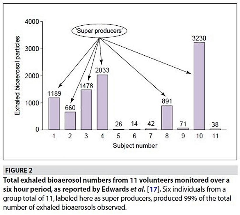 Tabii bu konuda bir diğer büyük problem, üretilen biyoaerosollerin kişiden kişiye çok ciddi farklar gösteriyor olmasıdır. Benzer hastalıkları benzer semptomlarla geçiren ve hastalığın benzer evrelerinde olan insanlardan bazıları çok az aerosol üretirken, bazıları çok fazla aerosol üretebilmektedir. Bu ikinci gruba süper üreticiler adı verilmektedir. Bu durum, SARS ve COVID-19 salgınlarında görülen süper bulaştırıcıların neden bu kadar fazla bulaştırıcılığa sahip olduğunun açıklamalarından birisi olabilir. Süper bulaştırıcılar, bir hastalığın ortalama temel bulaşıcılık sayısından çok daha fazla kişiye hastalığı bulaştırabilen kişilere verilen bir isimdir. Fiegel'in 2006 yılında yayınladığı makalesinde şöyle deniyor: