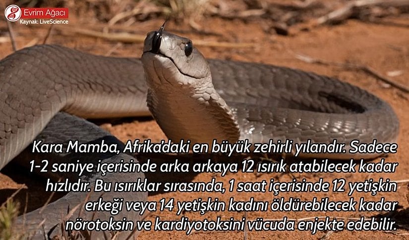 - Kara Mamba, Afrika’nın en büyük zehirli yılanı olup, 1-2 saniyede ardışık 12 ısırık atabilir ve bu ısırıklarla 1 saat içinde birçok yetişkini öldürebilecek kadar güçlü nörotoksin ve kardiyotoksin enjekte eder.