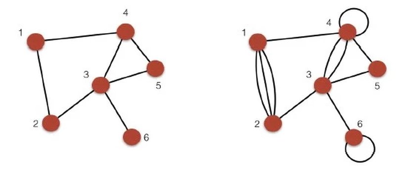 Soldaki bitişiklik matrisinin köşegeni sıfırdır ve matris simetriktir. Sağda ise simetri olmasına rağmen, ağ kendine bağlantı içerdiği için köşegeni sıfır değildir. Kendine bağlantıları içeren köşegen değerlerinin neden 1 değil de 2 olduğu bize, ağlardaki bağlantı türlerinin en başta iki gruba ayrılacağını söyler.