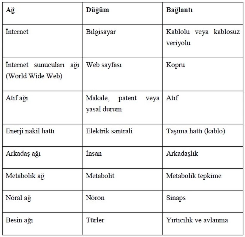 Bir ağ (İng: "Network"), en basit tanımıyla çizgilerle birbirlerine bağlanmış noktaları ifade eder. Matematiksel olarak ağlar "çizge", noktalar "köşe" ve çizgiler "kenar" olarak adlandırılır. Bu niceliklerin bilgisayar bilimlerindeki karşılığı ise "ağ", "düğüm" ve "bağlantı" kavramlarıdır. Fiziksel, biyolojik ve sosyal bilimlerdeki birçok sistem ağlar şeklinde ifade edilebilir. Düğüm ve bağlantıların çeşitli sistemlerdeki karşılıkları aşağıda gösterilmiştir.