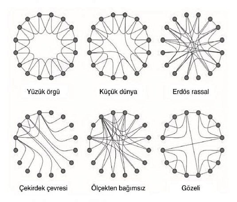 - Ağ bilimi temelinde yüzük örgü, küçük dünya, rassal (Erdös-Renyi), çekirdek çevresi, ölçekten bağımsız ve gözeli topolojiler bulunur ve bu modeller farklı ağ yapıları tanımlar.