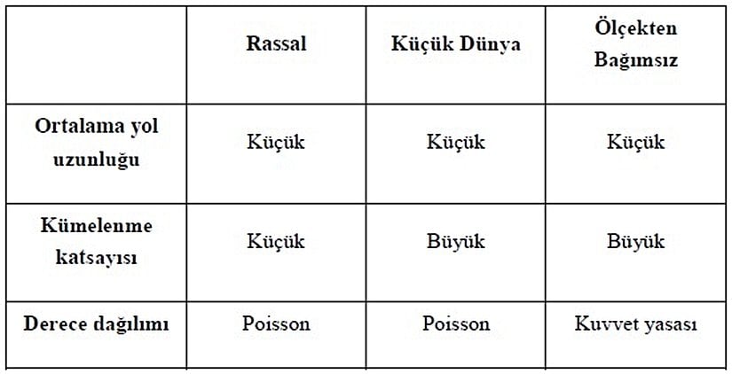 Buraya kadar değinilen üç temel ağ modeli ile ilgili derece dağılımı, kümelenme katsayısı ve ortalama yol uzunluğunun özeti aşağıdaki çizelgede verilmiştir.