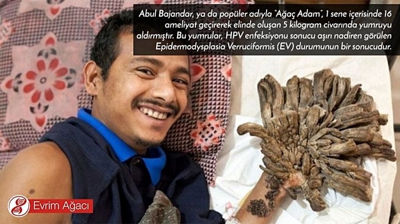 Bu fotoğrafta gördüğünüz 27 yaşındaki Abul Bajandar. Kendisinin elleri ve ayakları, fotoğrafta görüldüğü gibi ağaç kabuğuna benzer ve toplamda 5 kilogram kütleye sahip yumrularla kaplı. Buna neden olan ise, İnsan Papilloma Virüsü ya da HPV olarak da bilinen virüsün neden olduğu aşırı nadir bir durum: "Epidermodysplasia verruciformis", ya da EV.