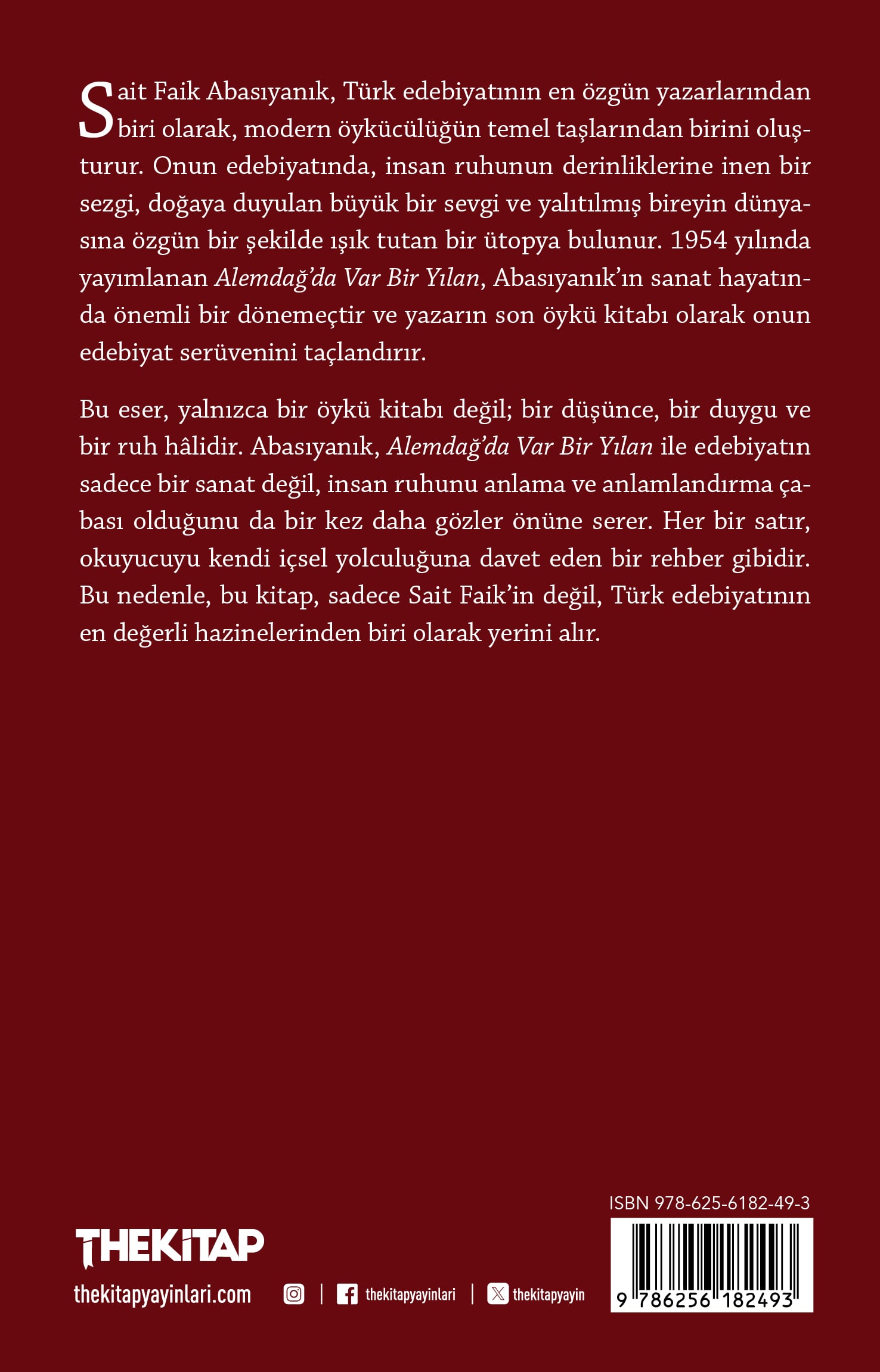 Sait Faik Abasıyanık, Türk edebiyatının en özgün yazarlarından biri olarak, modern öykücülüğün temel taşların dan birini oluşturur. Onun edebiyatında, insan ruhunun derinliklerine inen bir sezgi, doğaya duyulan büyük bir sevgi ve yalıtılmış bireyin dünyasına özgün bir şekilde ışık tutan bir ütopya bulunur. 1954 yılında yayımlanan Alemdağ’da Var Bir Yılan, Abasıyanık’ın sanat hayatında önemli bir dönemeçtir ve yazarın son öykü kitabı olarak onun edebiyat serüvenini taçlandırır. Bu eser, yalnızca bir öykü kitabı değil; bir düşünce, bir duygu ve bir ruh hâlidir. Abasıyanık, Alemdağ’da Var Bir Yılan ile edebiyatın sadece bir sanat değil, insan ruhunu anlama ve anlamlandırma çabası olduğunu da bir kez daha gözler önüne serer. Her bir satır, okuyucuyu kendi içsel yolculuğuna davet eden bir rehber gibidir. Bu nedenle, bu kitap, sadece Sait Faik’in değil, Türk edebiyatının en değerli hazinelerinden biri olarak yerini alır.