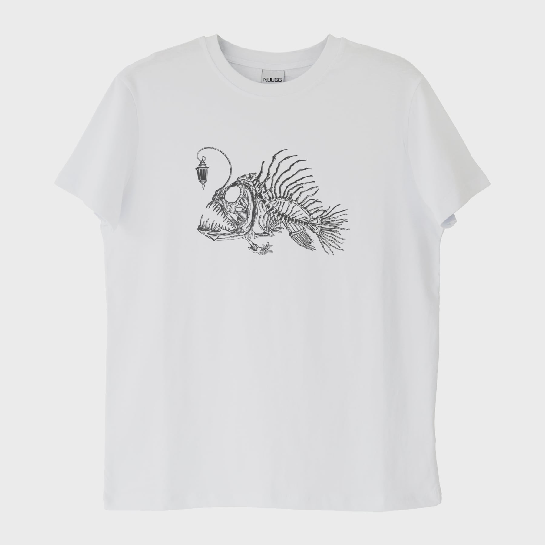 Karanlık Derinliklerden Gelen Stil Okyanusların en ürkütücü ama bir o kadar da etkileyici canlılarından ilham alan bu tasarım, fener balığının korkusuz ruhunu ve eşsiz siluetini tişörtüne taşıyor. Işığını karanlıkta taşıyan bu canlı, burada sadece bir iskeletle değil, karanlıkla dans eden bir tarzl...