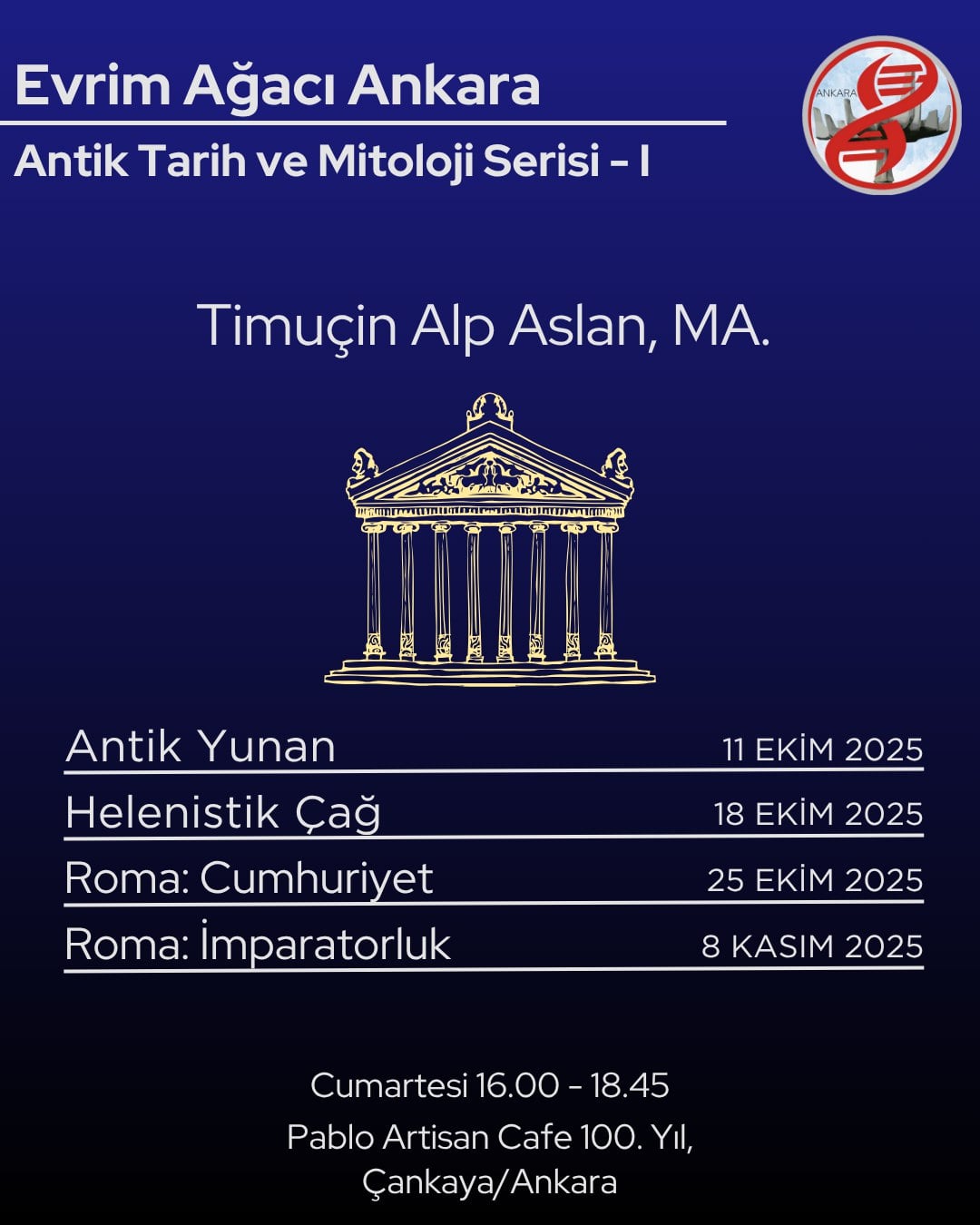 Evrim Ağacı Antik Tarih ve Mitoloji Dersleri 1. kısım, 11 Ekim 2025 tarihinde saat 16.00’da ilk dersi ile başlayacaktır. Toplamda 4 ders yapılacaktır ve 4 hafta sürecektir.