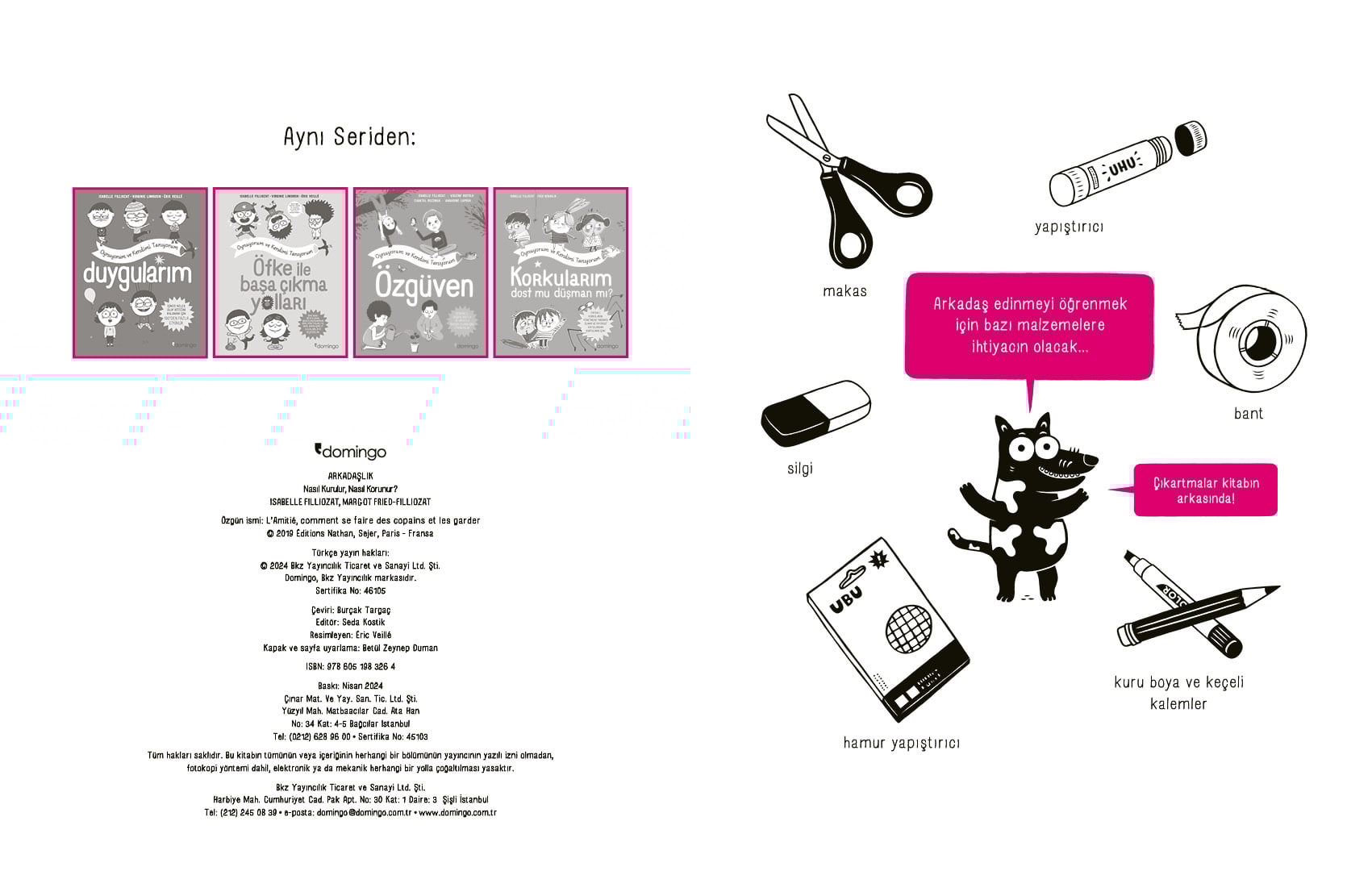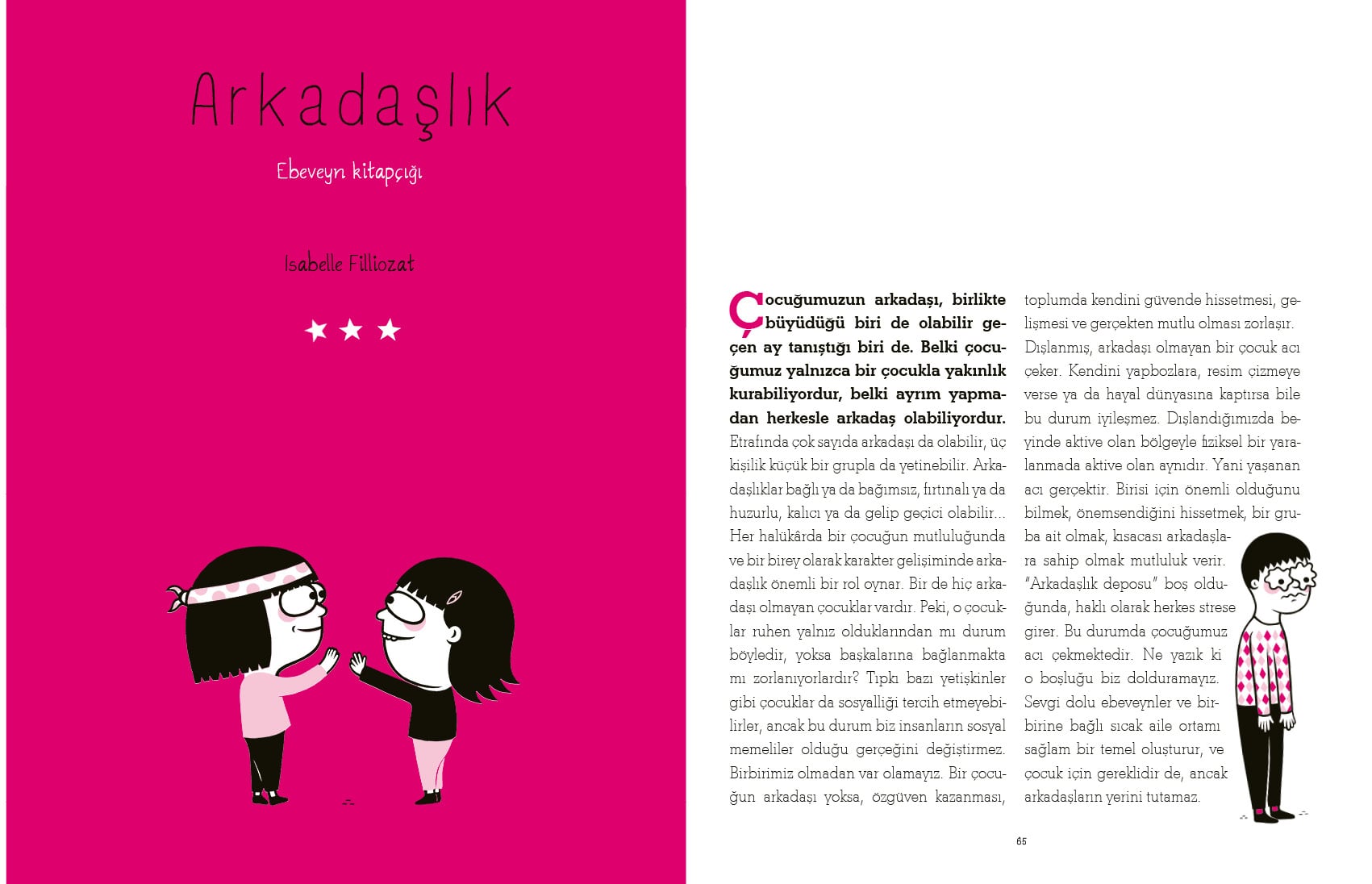 ARKADAŞLIK NASIL KURULUR VE NASIL KORUNUR? Arkadaş edinmek her zaman düşündüğümüz kadar kolay olmayabiliyor, öyle değil mi? Bazen herkes gibi sen de arkadaşlarınla sorunlar yaşıyor ya da yeni arkadaşlıklar kurarken engellerle karşılaşabiliyorsun. Ama merak etme, bu kitapta sana yardımcı olacak birçok etkinlik ve ipucu bulacaksın! – Ama ben çok utangacım... – Ya yeni başladığım okulda kimse benimle konuşmazsa... – En yakın arkadaşım benim yerime başkasıyla oyun oynadığında onu çok kıskanıyorum! – Irmak artık benimle arkadaş olmak istemediğini söyledi. Şimdi ne yapacağım? İYİ HABER ŞU Kİ ARKADAŞLIK ÖĞRENİLEBİLİR... VE GELİŞTİRİLEBİLİR! Ortaokul ve liselerde duygusal eğitim üzerine konuşmacılık yapan Margot Fried-Filliozat ve pozitif ebeveynlik yönteminin öncülerinden, psikoterapist ve Kalp Zekâsı, Denemediğim Yol Kalmadı isimli çok satan kitapların yazarı Isabelle Filliozat tarafından kaleme alınmış, Éric Veillé tarafından resimlendirilmiştir. 5 YAŞ ÜSTÜ EBEVEYN KİTAPÇIĞI, 50'DEN FAZLA ETKİNLİK VE ÇIKARTMAYLA BİRLİKTE!