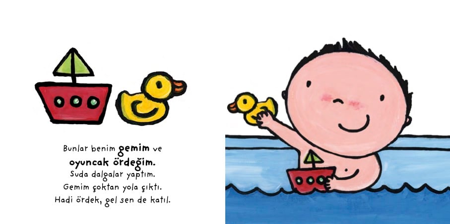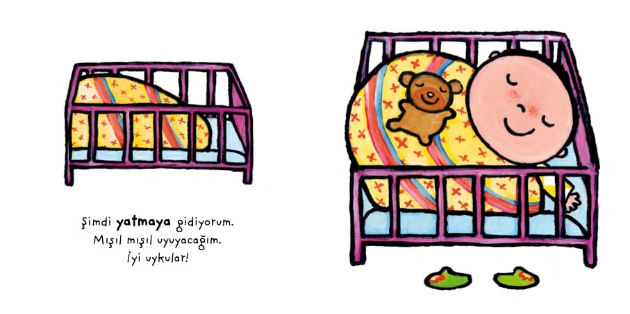 Banyo yapıyorum. Annem saçımı yıkıyor, ben de göbeğimi yıkıyorum. Suda biraz daha oynuyorum. Sonra yumuşacık havluma sarınıyorum. Ardından pijamalarımı giyiyorum. Biberonumdan sütümü içiyor, kitabımı okuyorum. Uykum geldi bile. Artık ayıcığıma sarılıp yatabilirim. Banyo ve uyku rutinlerine...