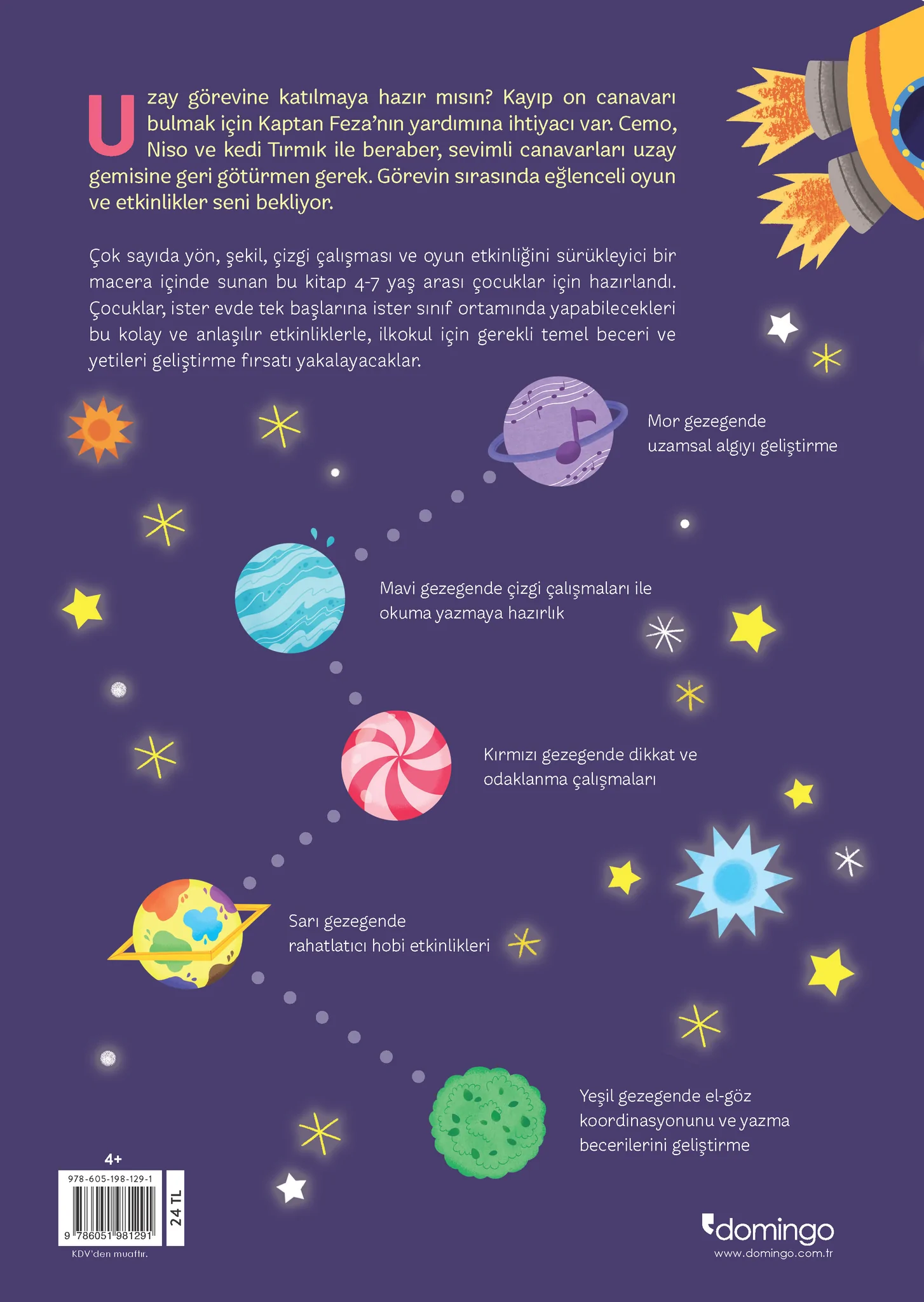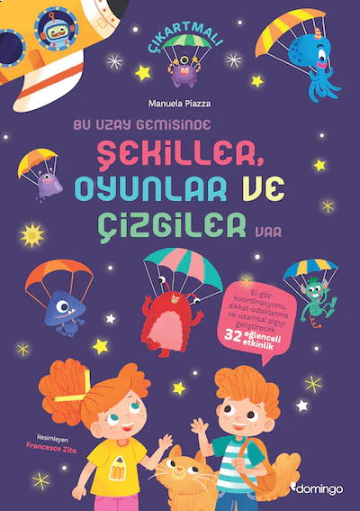 El-Göz Koordinasyonu, Dikkat-Odaklanma Ve Uzamsal Algıyı Geliştirecek 32 Eğlenceli Etkinlik / Çıkartmalı Uzay görevine katılmaya hazır mısın? Kayıp on canavarı bulmak için Kaptan Feza’nın yardımına ihtiyacı var. Cemo, Niso ve kedi Tırmık ile beraber, sevimli canavarları uzay gemisine geri götürmen gerek. Görevin sırasında eğlenceli oyun ve etkinlikler seni bekliyor. Çok sayıda yön, şekil, çizgi çalışması ve oyun etkinliğini sürükleyici bir macera içinde sunan bu kitap 4-7 yaş arası çocuklar için hazırlandı. Çocuklar, ister evde tek başlarına ister sınıf ortamında yapabilecekleri bu kolay ve anlaşılır etkinliklerle, ilkokul için gerekli temel beceri ve yetileri geliştirme fırsatı yakalayacaklar. Mor gezegende uzamsal algıyı geliştirme Mavi gezegende çizgi çalışmaları ile okuma yazmaya hazırlık Kırmızı gezegende dikkat ve odaklanma çalışmaları Sarı gezegende rahatlatıcı hobi etkinlikleri Yeşil gezegende el-göz koordinasyonunu ve yazma becerilerini geliştirme