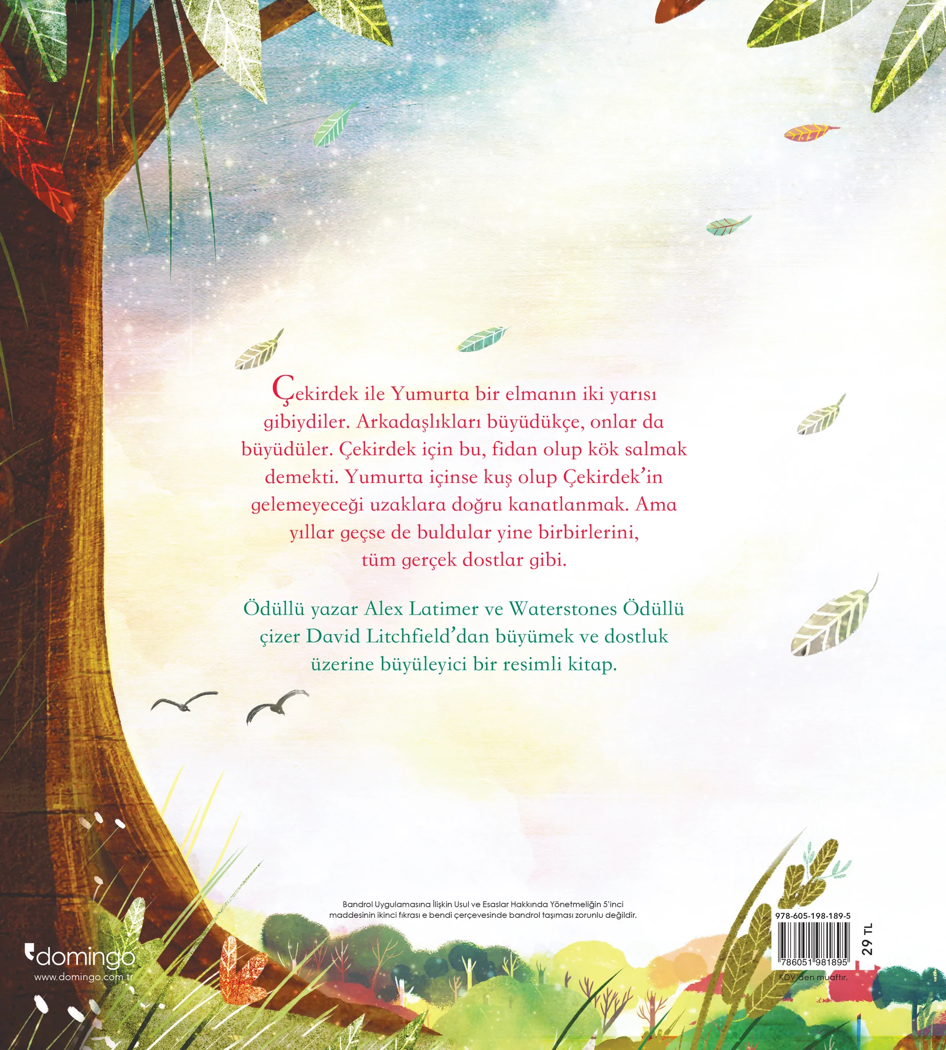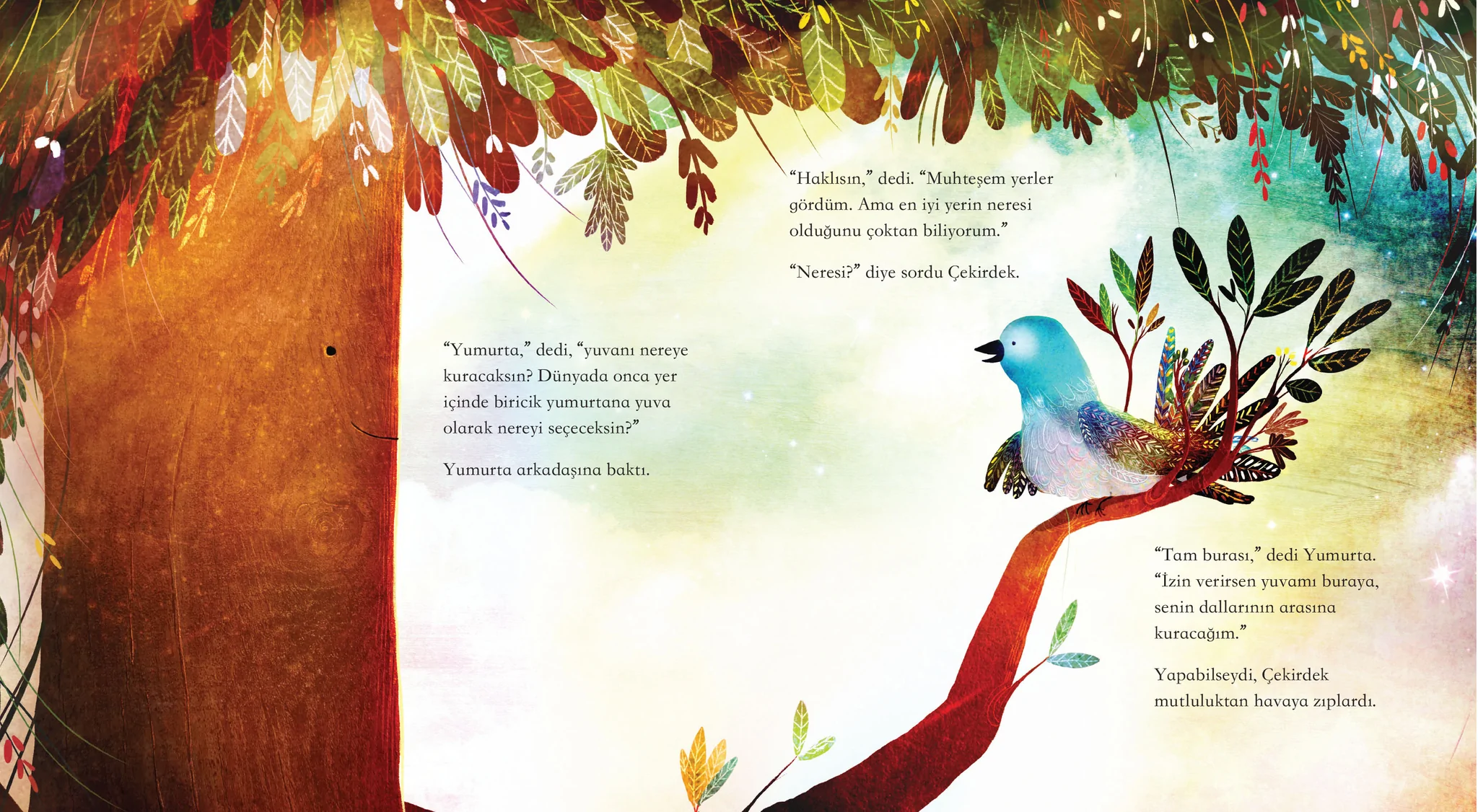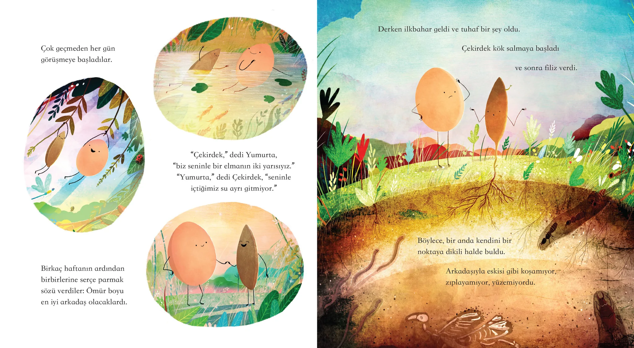 Çekirdek ile Yumurta bir elmanın iki yarısı gibiydiler. Arkadaşlıkları büyüdükçe, onlar da büyüdüler. Çekirdek için bu, fidan olup kök salmak demekti. Yumurta içinse kuş olup Çekirdek'in gelemeyeceği uzaklara doğru kanatlanmak. Ama yıllar geçse de buldular yine birbirlerini, tüm gerçek dostlar gibi.