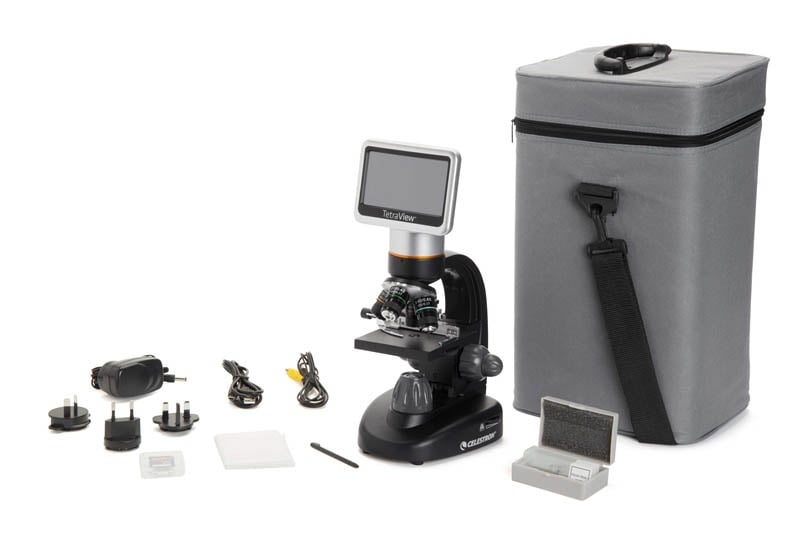 Celestron 44347 Tetraview LCD Dijital Mikroskop - Büyütme gücü – 40x to 400x (dijital zoom ile 1600x kadar) - 4.3'' Dokunmatik LCD Ekran - 5 MP CMOS dahili dijital kamera - 4x/10x/20x/40x Objektif lensleri - Ayarlanabilir LED alt aydınlatma - 180° Dönebilen ekran - Tamamen Mekanik tabla - Çift odak ayarı (kaba ve ince) - Filtre tekeri/diafram - AV/TV ara kablo ile aktarım imkanı - İsteğe bağlı pil ile çalışabilme imkanı - 2 GB SD kart (SD kart yuvası 32 GB'a kadar destekler) - AC Adaptörü – Evrensel 110 to 240-volt tüm dünya kullanımı için çoklu başlık ile - 7 hazır slayt, sert taşıma çantası, toz kapağı, dokunmatik kalem, USB kablosu, AV çıkışı kablosu Boyutlar; 178 mm x 140 mm x 330 mm Ağırlık; 1.9 kg
