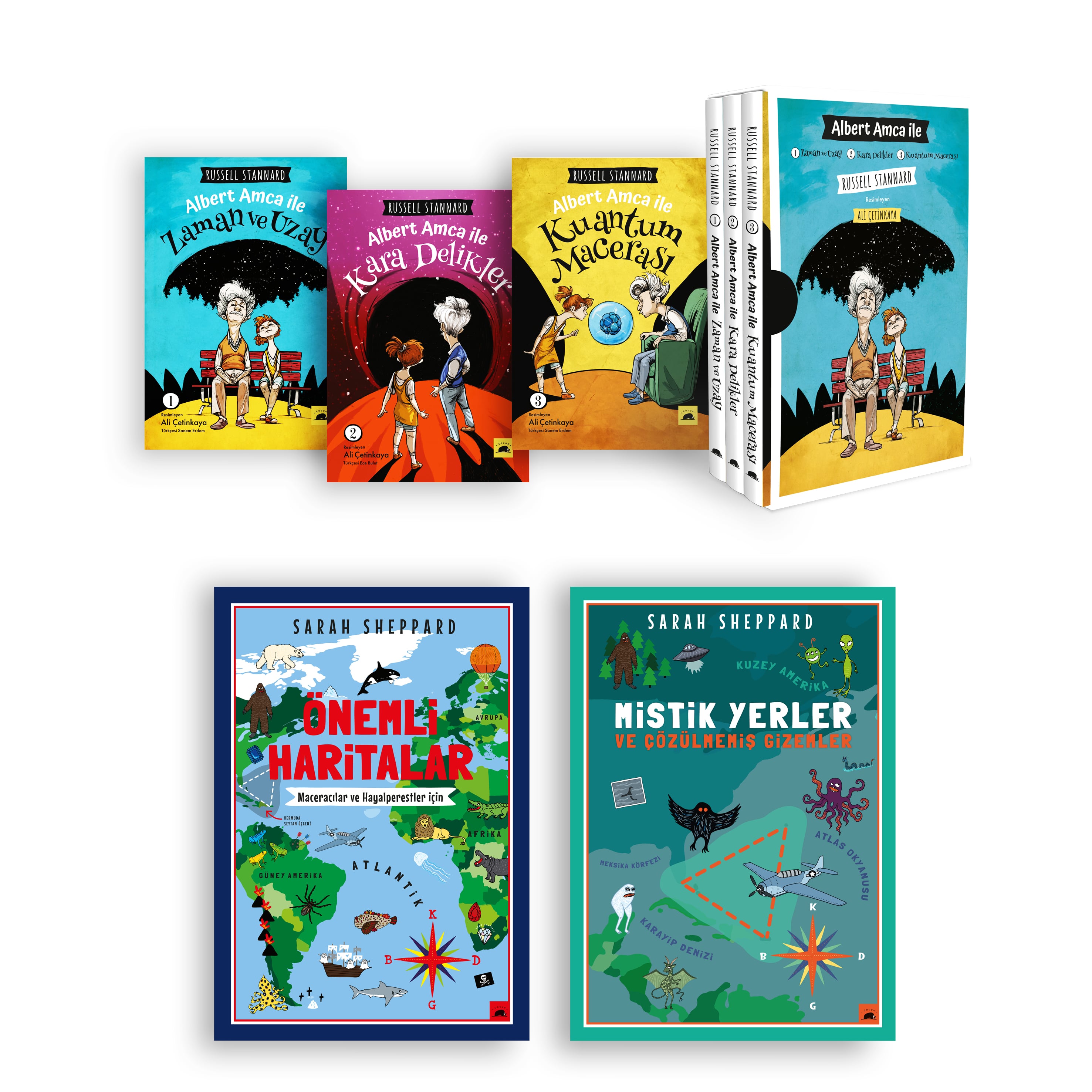 Çocuklarınıza bilimi sevdirecek, bilimsel kavramları öğretecek kitaplar arıyor ama bulamıyor musunuz? Bu seri tam size göre! Albert Amca ile Zaman ve Uzay, Russell Stannard Albert Amca ile Kara Delikler,Russell Stannard Albert Amca ile Kuantum Macerası,Russell Stannard Mistik Yerler ve Çözülmemiş Gizemler Atlantis neredeydi? Kutsal Kâse’yi kimler aldı? 51’inci Bölge’de ne tür karanlık işler dönüyor? Eğer siz de diğer milyonlarca insan gibi bu soruların yanıtlarını merak ediyorsanız ya da dünyanın en gizemli yerlerinden birine seyahat etmeyi planlıyorsanız, Mistik Yerler ve Çözülmemiş Gizemler tam size göre! İyi yolculuklar! Önemli Haritalar: Maceracılar ve Hayalperestler İçin (Sarah Sheppard) Bermuda Şeytan Üçgeni nerededir? Güney Kutbu’na ilk kimler gitti? Dünyanın en tehlikeli hayvanı nerede yaşar? Gezegenimizin derinliklerinde neler oluyor? Dağlar nasıl oluştu? Denizlerin en derin noktası nerededir? Bu kitaptaki haritaları inceleyerek yeryüzünün en esrarengiz yerleri ve en fantastik canlılarıyla tanışacak, kâşiflere ve korsanlara maceralarında eşlik edeceksiniz. Kıtaları, okyanusları, yüksek dağları, derin çukurları, yeraltının gizemlerini, kısacası gezegenimizi keşfedeceksiniz. İyi yolculuklar!