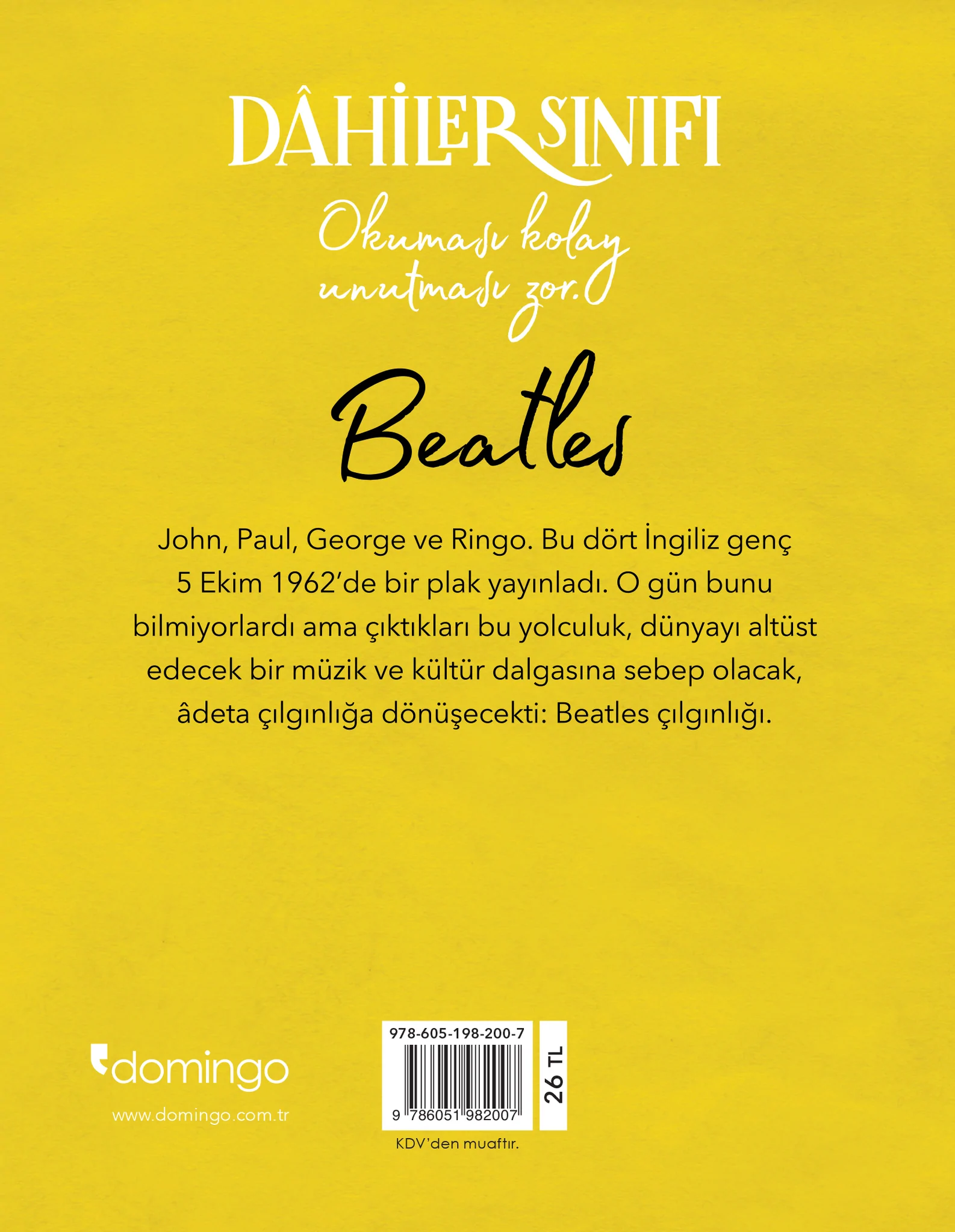 DÂHİLER SINIFI: OKUMASI KOLAY, UNUTMASI ZOR John, Paul, George ve Ringo. Bu dört İngiliz genç 5 Ekim 1962’de bir plak yayınladı. O gün bunu bilmiyorlardı ama çıktıkları bu yolculuk, dünyayı altüst edecek bir müzik ve kültür dalgasına sebep olacak, âdeta çılgınlığa dönüşecekti: Beatles çılgınlığı....
