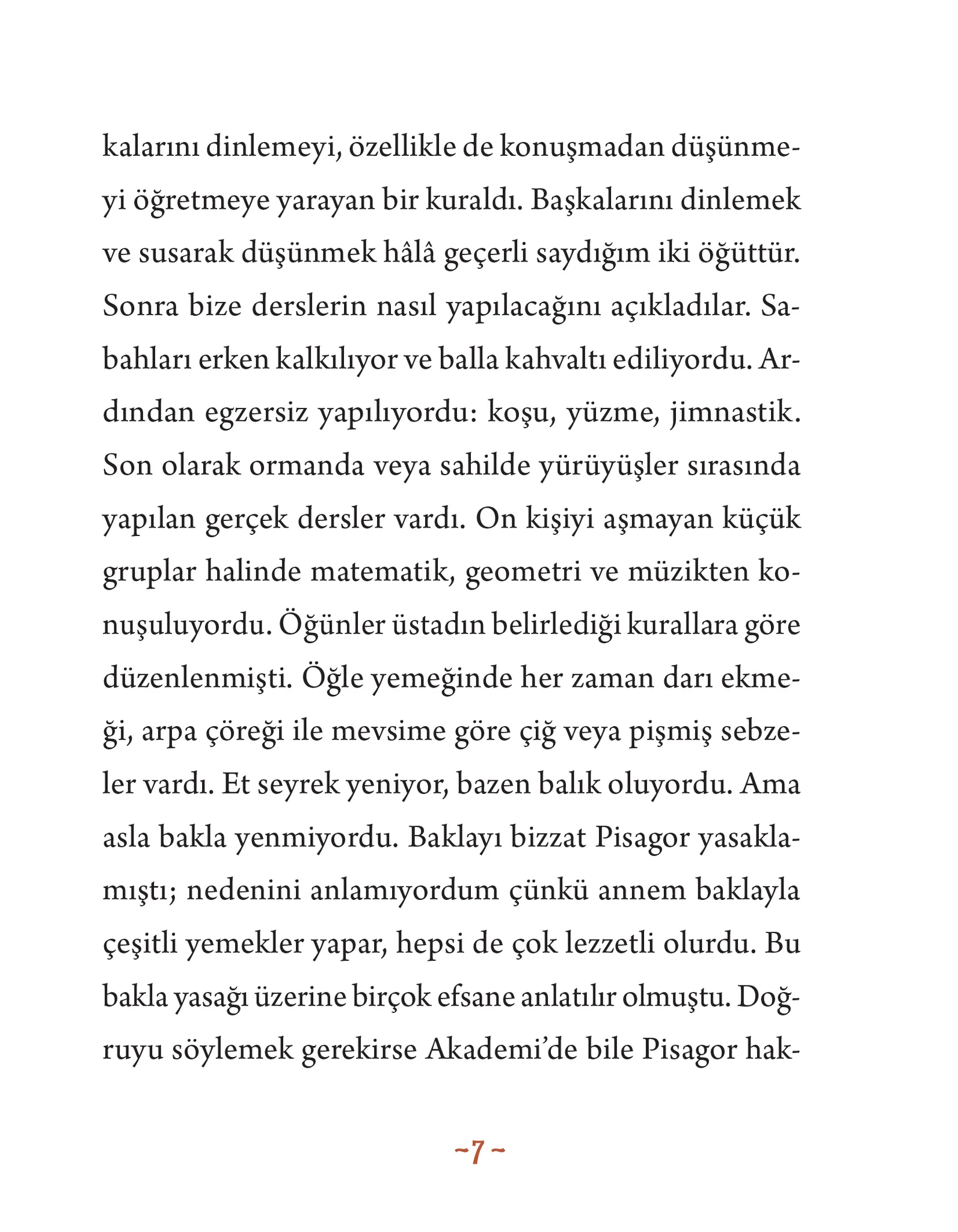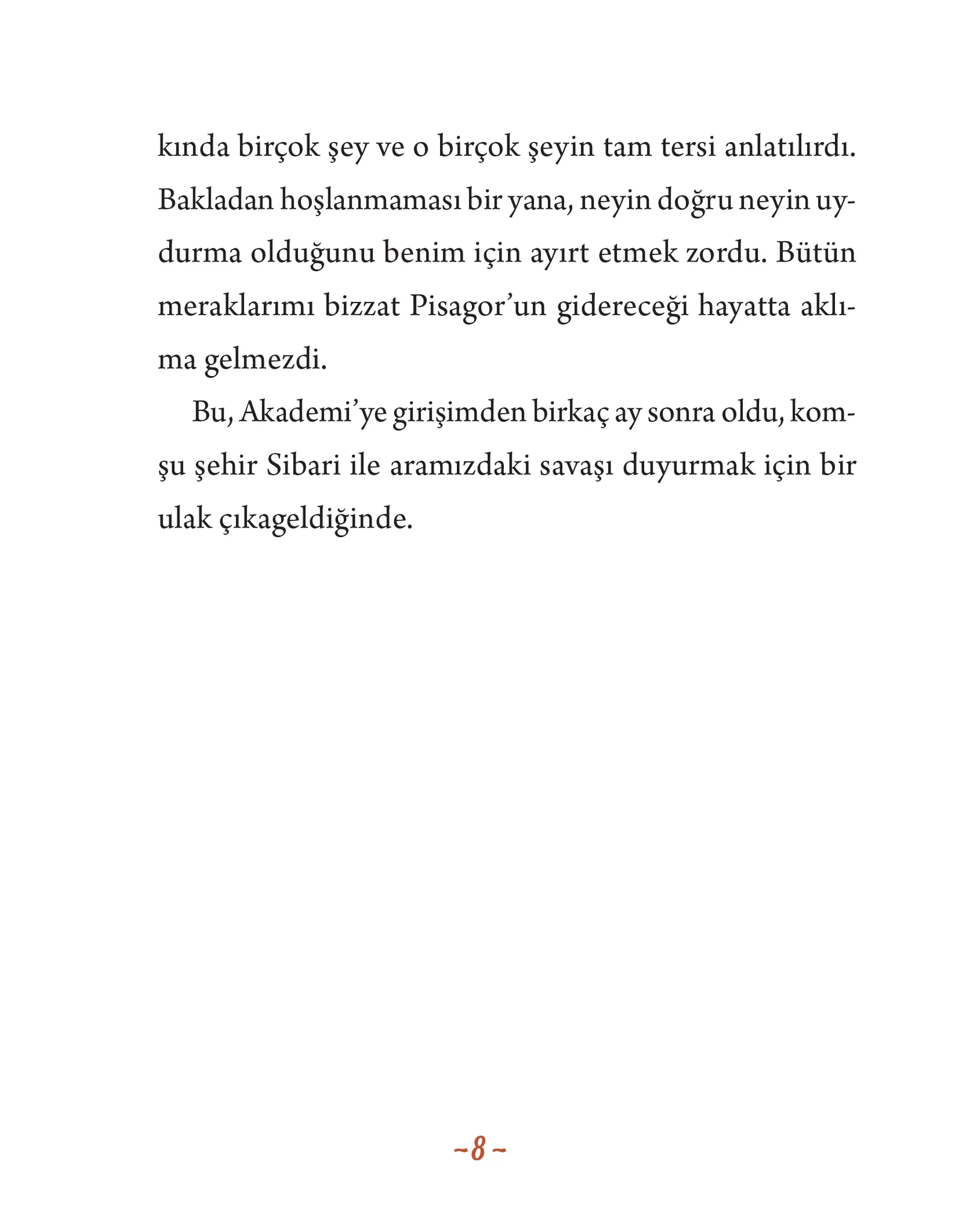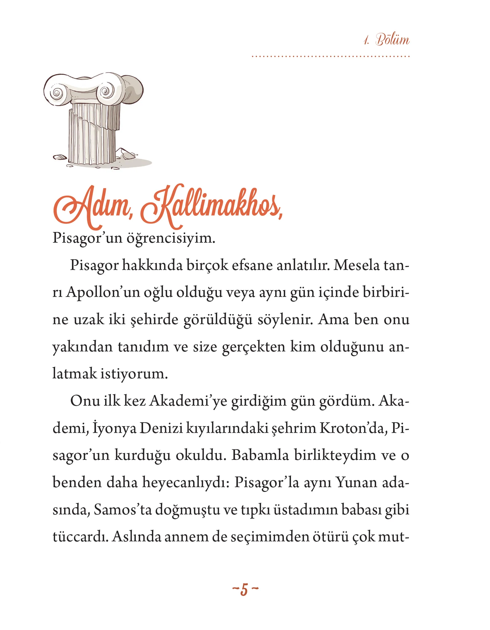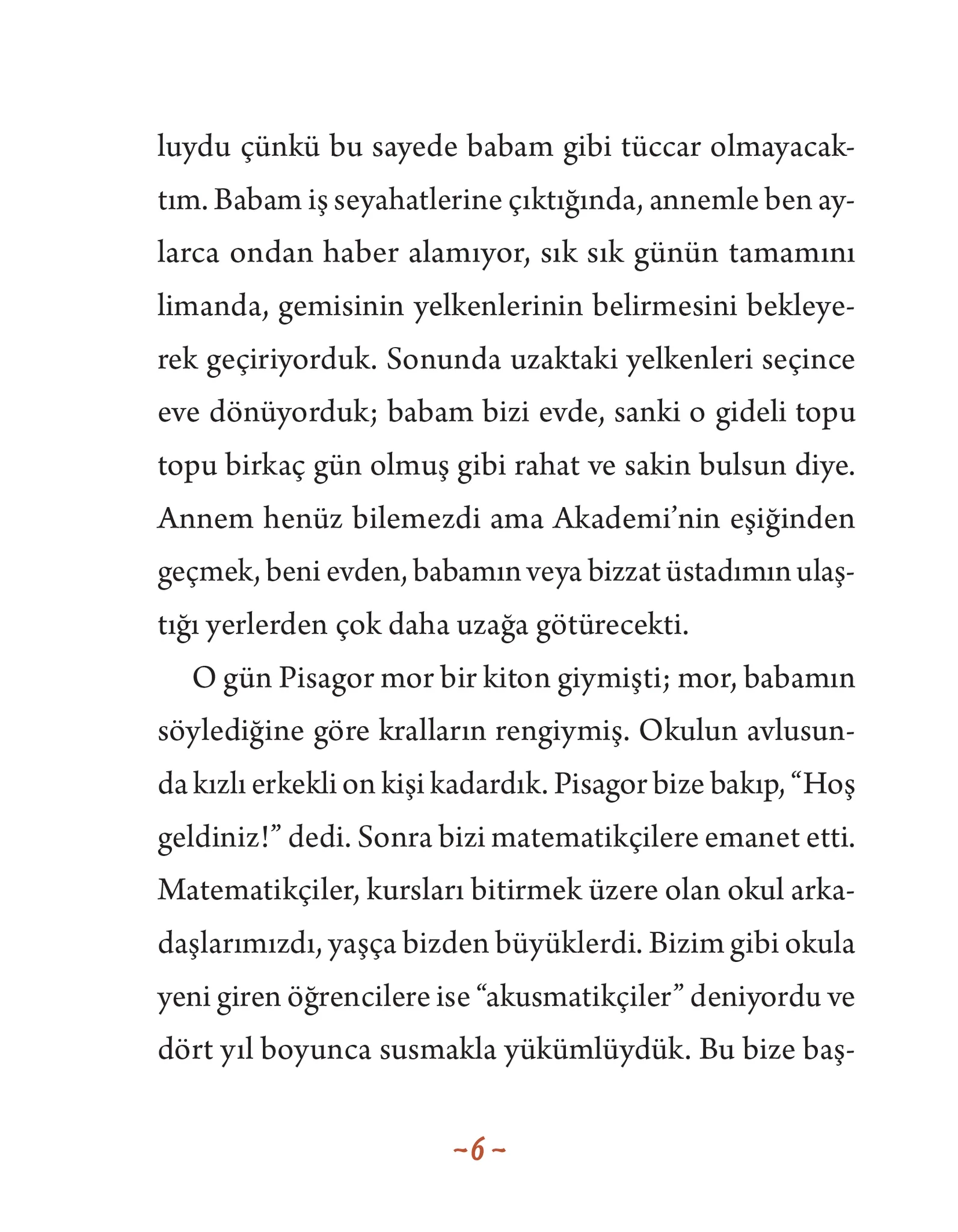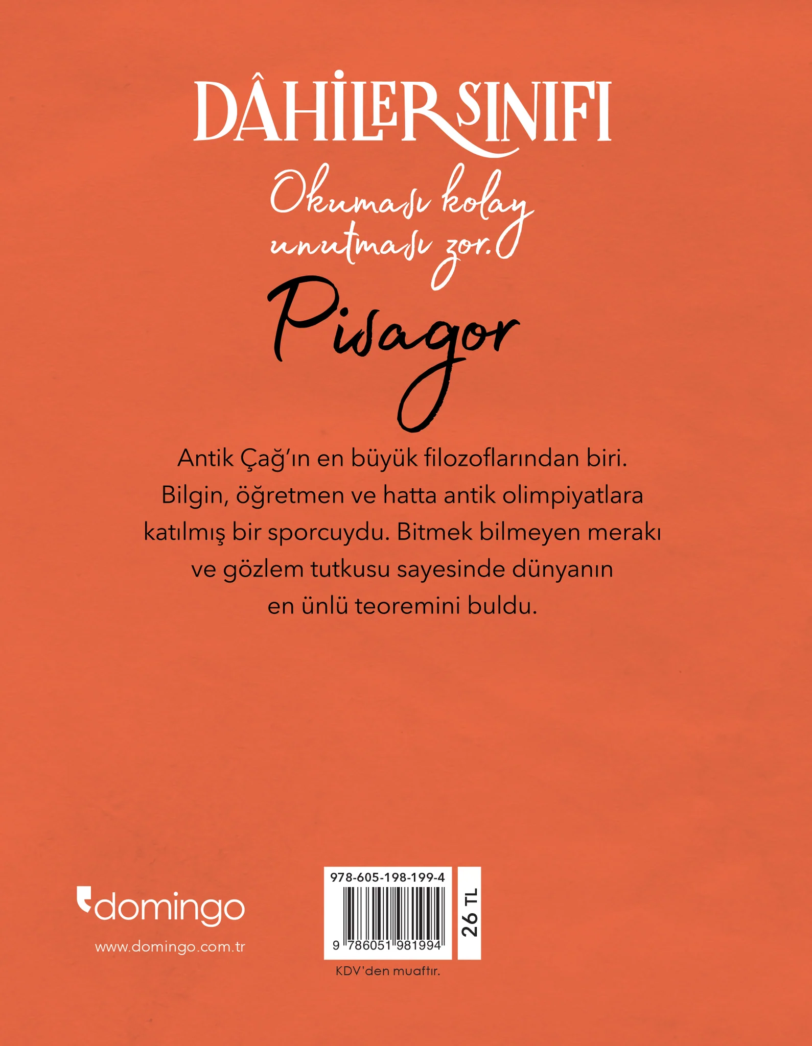 DÂHİLER SINIFI: OKUMASI KOLAY, UNUTMASI ZOR Antik Çağ’ın en büyük filozoflarından biri. Bilgin, öğretmen ve hatta antik olimpiyatlara katılmış bir sporcuydu. Bitmek bilmeyen merakı ve gözlem tutkusu sayesinde dünyanın en ünlü teoremini buldu. Büyük ilgi gören Dâhiler Sınıfı serisi PİSAGOR - VE DÜNYANIN EN ÜNLÜ TEORİMİ ile devam ediyor. Dâhiler Sınıfı Serisi Hakkında: Bunlar, her biri kendi yöntemiyle; kelimeleriyle, icatlarıyla, seçimleriyle ve hatta kaderleriyle dünyayı değiştirmiş kadınların ve erkeklerin hayat hikâyeleri; şaşkınlık ve hayranlık duymanızı sağlayacak, hayal gücü ve merak duygunuzu harekete geçirecek büyüleyici hikâyeler. Dâhiler Sınıfı serisi bu özel insanları çocuklarla (9 yaş ve üstü) tanıştırmak üzere tasarlandı. İlk olarak yayımlandığı İtalya’da büyük övgü toplayan ve ardından pek çok dile çevrilen Dâhiler Sınıfı, minik ebadı, renkli illüstrasyonları, bilgiyi heyecan ve macerayla birleştiren anlatımıyla çocukların kolay okuyacağı, zor unutacağı, onlara öğrendiklerinden daha da fazlasını merak ettirecek bir seri.