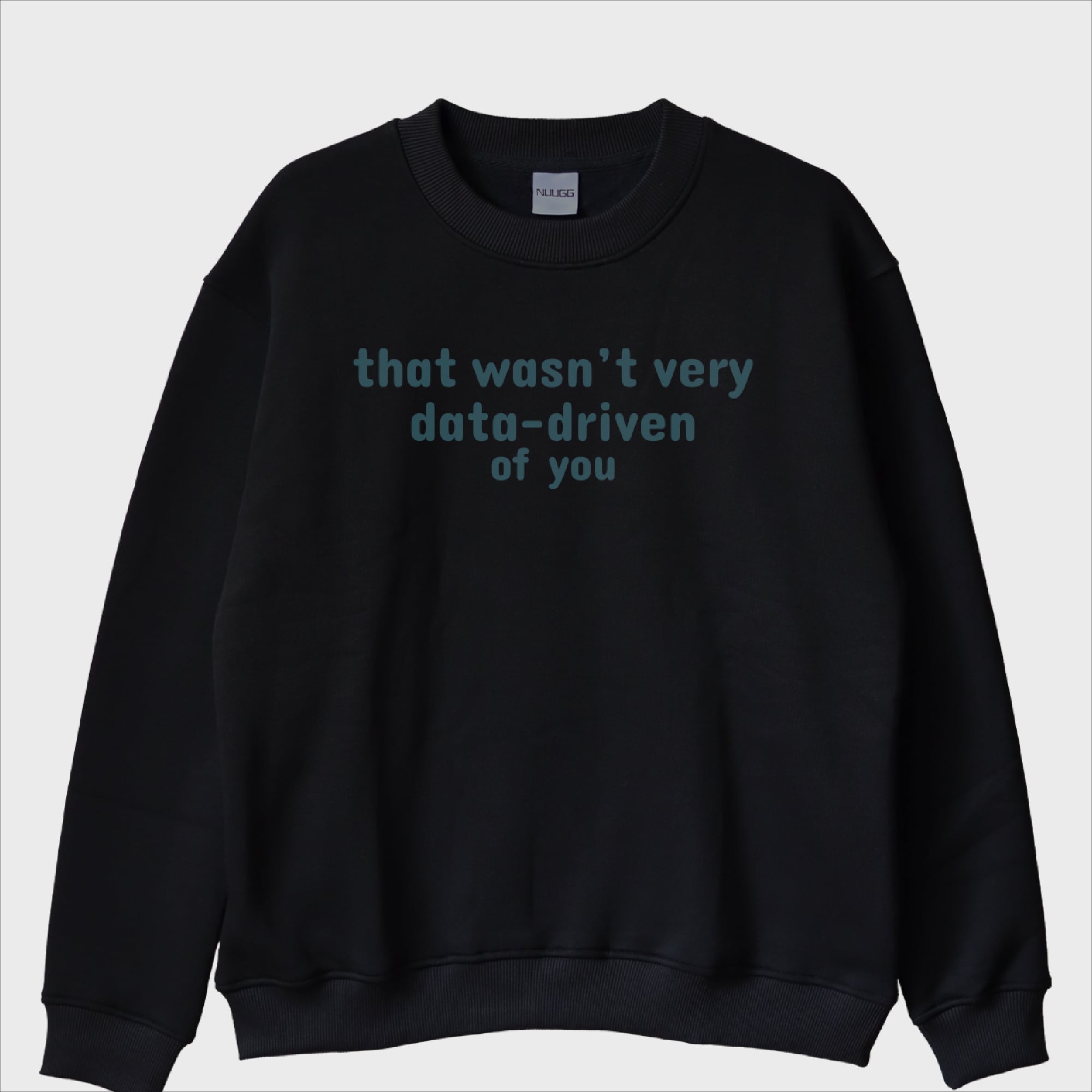 Hayatını veriye göre yaşayanlara özel bir parça. “Data-driven of you”, teknoloji ve ironi sevenler için üretildi. Bilgiler ve Uyarılar: Renk Bilgileri: Sweatshirt siyah olarak üretilebilmektedir. Beden Bilgileri: Stokta kalan ürünlerimiz arasından dilediğiniz bedeni seçebilirsiniz. Sweats...