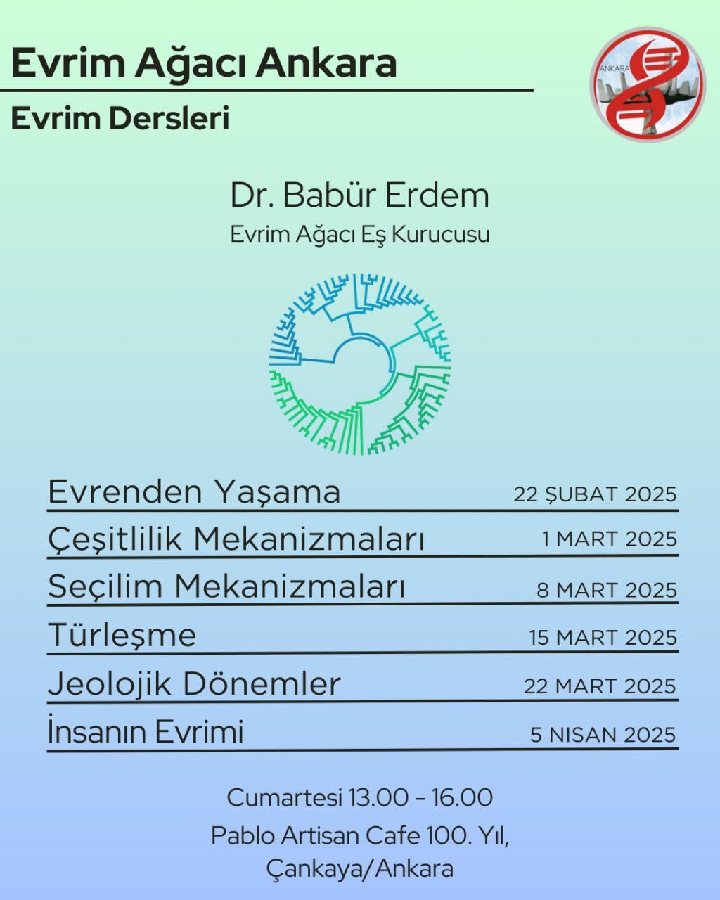 Evrim Ağacı Evrime Giriş Dersleri, 22 Şubat 2025 tarihinde saat 13.00’da ilk dersi ile başlayacaktır. Toplamda 6 ders yapılacaktır ve 6 hafta sürecektir.