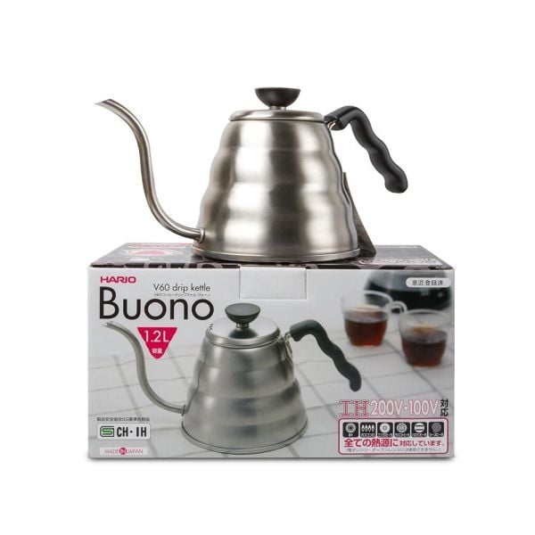 Hario V60 Drip Kettle 1.2 lt Sıcak suyun akışını kontrol etmeye imkan sağlayan Hario V60 Buono Kettle, Hario V60 Dripper’lar ile kahve demlemek için özel tasarlanmış bir kettle. Tüm dünyada baristaların birinci tercihi olan Hario V60 Buono Kettle kahve meraklılarının da favorisi.