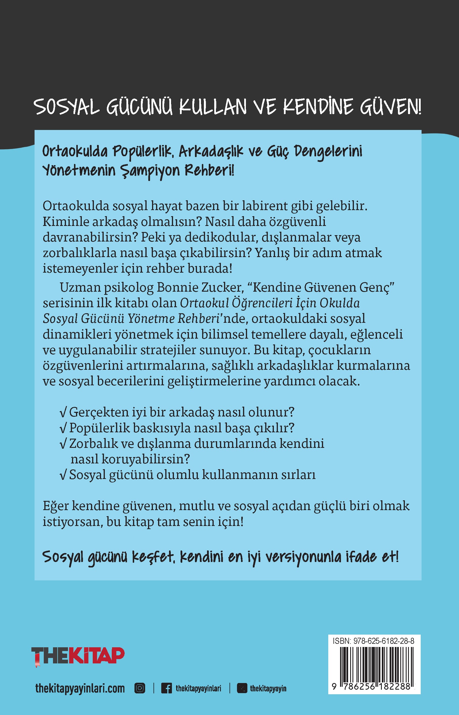 Ortaokulda Popülerlik, Arkadaşlık ve Güç Dengelerini Yönetmenin Şampiyon Rehberi! Ortaokulda sosyal hayat bazen bir labirent gibi gelebilir. Kiminle arkadaş olmalısın? Nasıl daha özgüvenli davranabilirsin? Peki ya dedikodular, dışlanmalar veya zorbalıklarla nasıl başa çıkabilirsin? Yanlış bir adım atmak istemeyenler için rehber burada! Uzman psikolog Bonnie Zucker, “Kendine Güvenen Genç” serisinin ilk kitabı olan Ortaokul Öğrencileri İçin Okulda Sosyal Gücünü Yönetme Rehberi’nde, ortaokuldaki sosyal dinamikleri yönetmek için bilimsel temellere dayalı, eğlenceli ve uygulanabilir stratejiler sunuyor. Bu kitap, çocukların özgüvenlerini artırmalarına, sağlıklı arkadaşlıklar kurmalarına ve sosyal becerilerini geliştirmelerine yardımcı olacak. √ Gerçekten iyi bir arkadaş nasıl olunur? √ Popülerlik baskısıyla nasıl başa çıkılır? √ Zorbalık ve dışlanma durumlarında kendini nasıl koruyabilirsin? √ Sosyal gücünü olumlu kullanmanın sırları Eğer kendine güvenen, mutlu ve sosyal açıdan güçlü biri olmak istiyorsan, bu kitap tam senin için! Sosyal gücünü keşfet, kendini en iyi versiyonunla ifade et!
