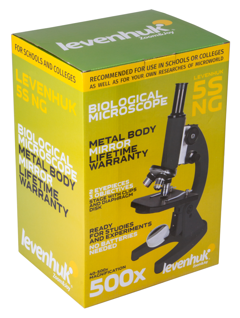 Levenhuk 5S NG Mikroskop, basit, güvenilir ve güvenli bir optik araçtır. Mikroskop slaytlarının aydınlatılması için bir ayna kullanılır. Elektrik enerjisi veya AC güç kaynağı gerektirmediğinden çocukların elektrik ile temas etmesi gerekmeyecektir. Genç kaşifleri, güvenliğinden endişe etmeden cihazla tek başına bırakabilirsiniz. Aydınlatma yoğunluğu kontrolü için bir diyafram disk ayarından faydalanılır.