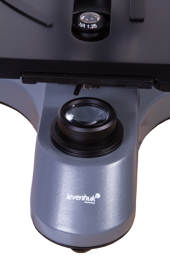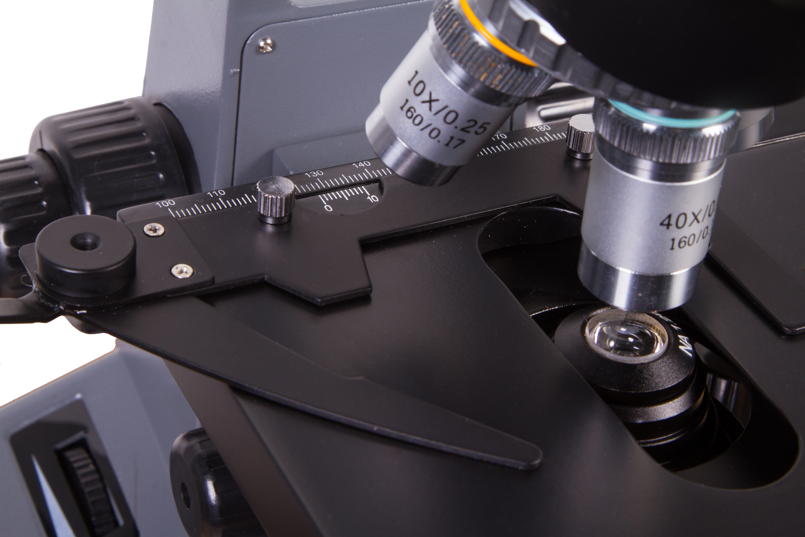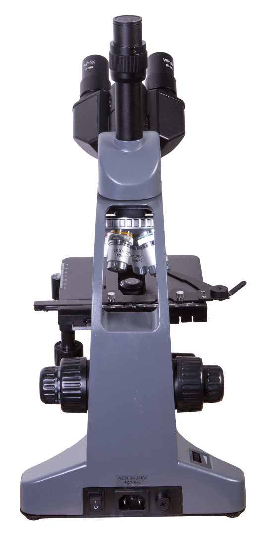 Trinoküler başlık, 45° eğimlidir ve kendi ekseni etrafında 360° döndürülebilir. Bu, özellikle gözlemlenen numunelere geniş bir kitlenin erişmesine ihtiyaç duyulan grup çalışmaları için kullanışlıdır; cihazın tamamı yerine yalnızca mikroskop başlığını çevirmeniz yeterlidir.