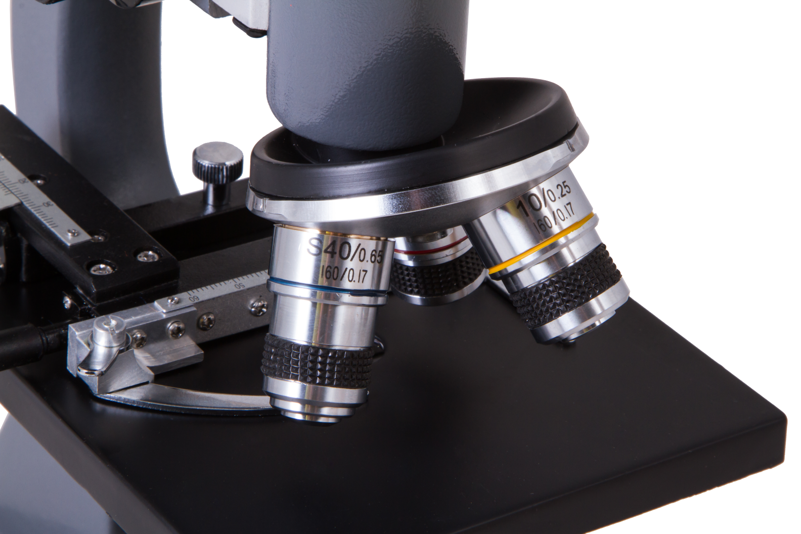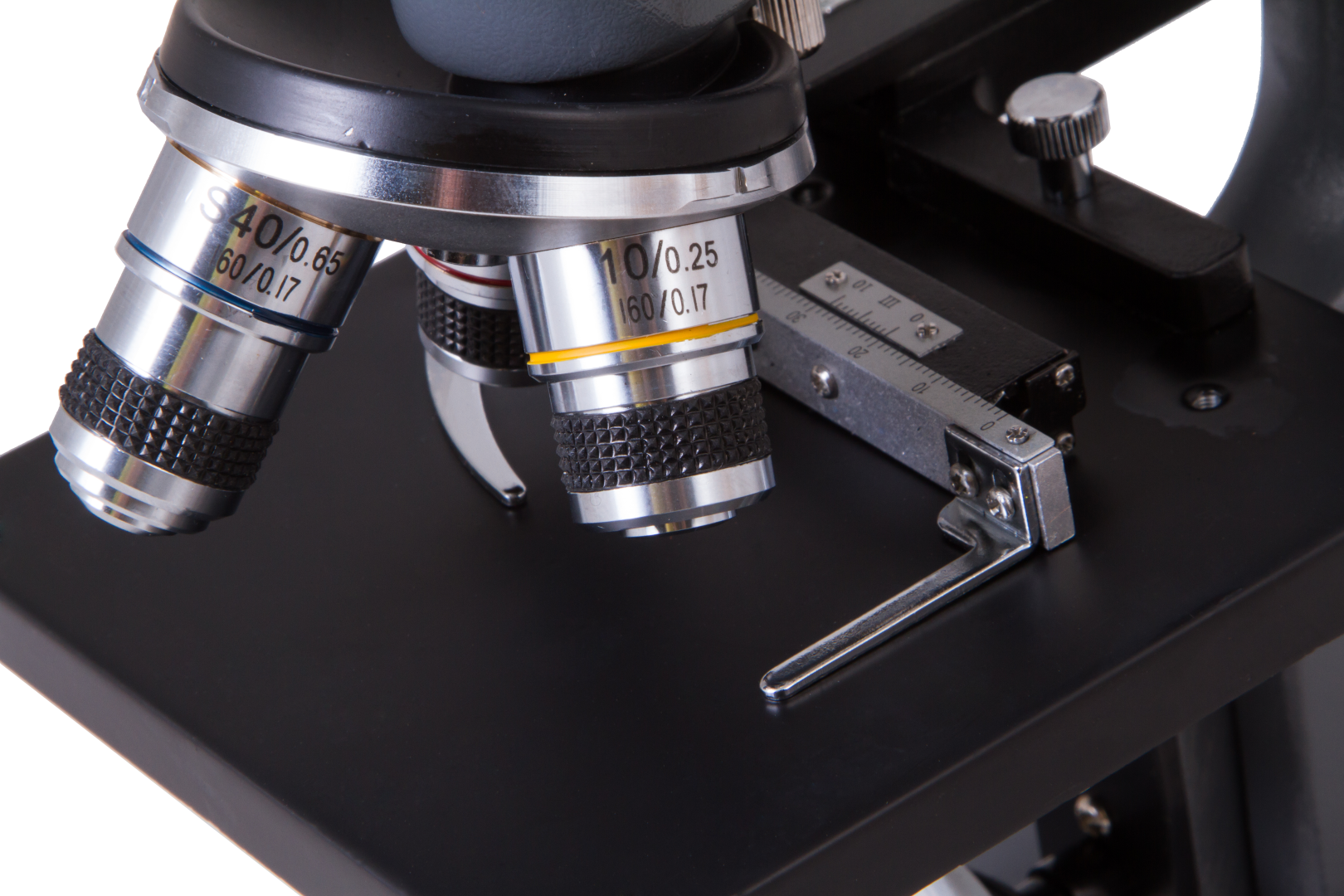 Levenhuk 7S NG'nin optik düzeni, farklı büyütme oranlı takılı objektif mercekleri ve iki göz merceği ile üç boşluklu bir döner burun parçasından oluşur. Sonuncular göz merceği tüpüne takılır ve mikroskopun büyütme oranı ile görüş alanının düzenlenmesine olanak tanır. Mikroskop slaytları lamel yuvasının üzerine yerleştirilir. Mikroskop slaytlarının iki eksen boyunca hareket ettirilmesine olanak tanıyan bir mekanik ölçek ile donatılmıştır: X ekseni (sol-sağ) ve Y ekseni (ileri-geri). İnce ve kaba odaklama düğmeleri keskinlik ayarı için kullanılır.
