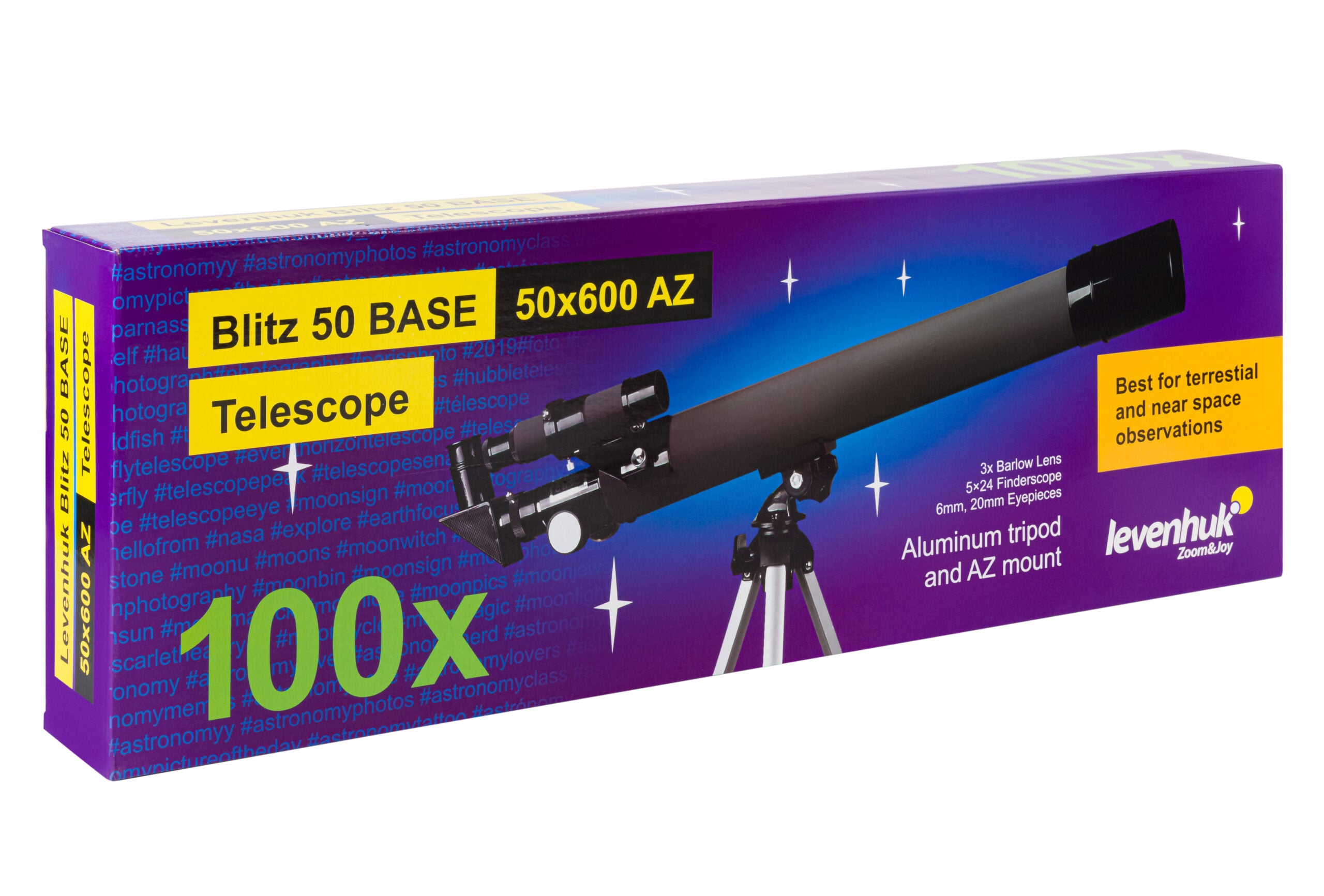 Levenhuk Blitz 50 BASE, çocuklar ve yeni başlayanlar için tasarlanmış giriş seviyesi bir refraktör teleskoptur. Ay gözlemleri ve yeryüzündeki cisimlerin incelenmesi için uygundur. Yansıma önleyici kaplamalı optik cam mercekler net görüntü sağlar.