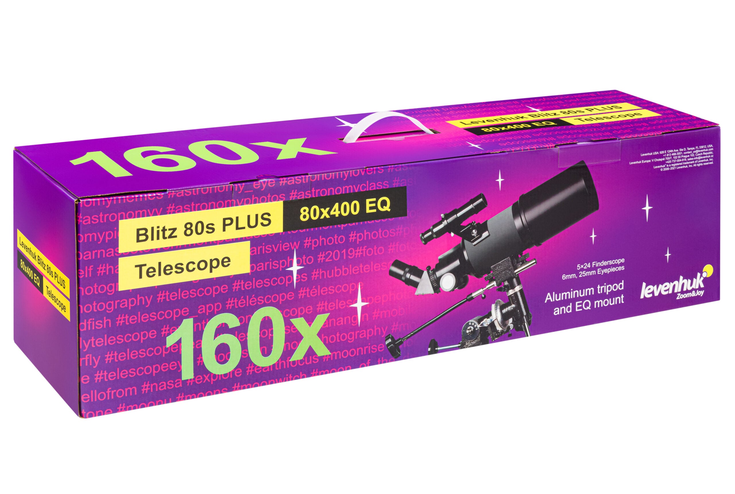 Levenhuk Blitz 80s PLUS, kısa odaklı ve 80 mm açıklıklı akromatik bir refraktör teleskoptur. Kompakt yapısı sayesinde taşınması kolaydır; kırsal alan gözlemleri ve temel astrofotoğrafçılık için uygundur. Ay, parlak derin uzay cisimleri ve Güneş Sistemi’ndeki bazı gezegenler gözlemlenebilir (ayrıntı düzeyi sınırlıdır). Yeryüzü gözlemleri için de kullanılabilir.