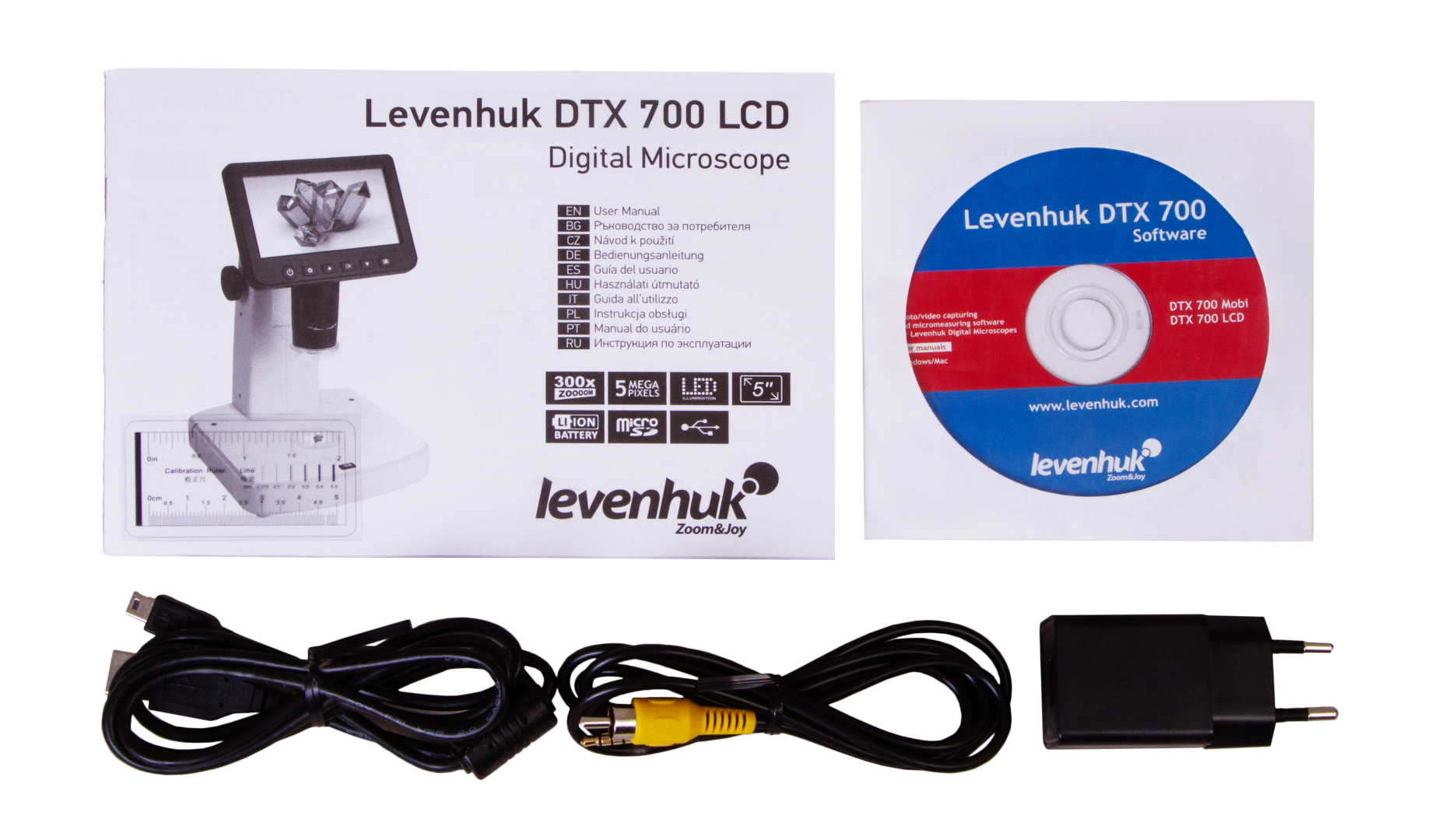 Bu kendine yeten mikroskop harici cihazlara bağlanılmasını gerektirmez. Fotoğraf ve videoların kaydedilmesi için bir bellek kartı (ayrıca satın alınır) gereklidir. Mikroskop bir harici monitöre, televizyona veya bilgisayara bağlanabilir. Kit, gereken tüm kabloları ve yazılımı içerir. Not: bilgisayara yüklenen yazılım, nesnelerin ölçülebilmesini sağlar (çizgi, yarıçap, çap, üç noktalı açı). Bu yazılım, aynı zamanda bir mikroskopun çektiği görüntülerin üstüne ekstra görüntüler ve metinler eklenmesini mümkün kılar.