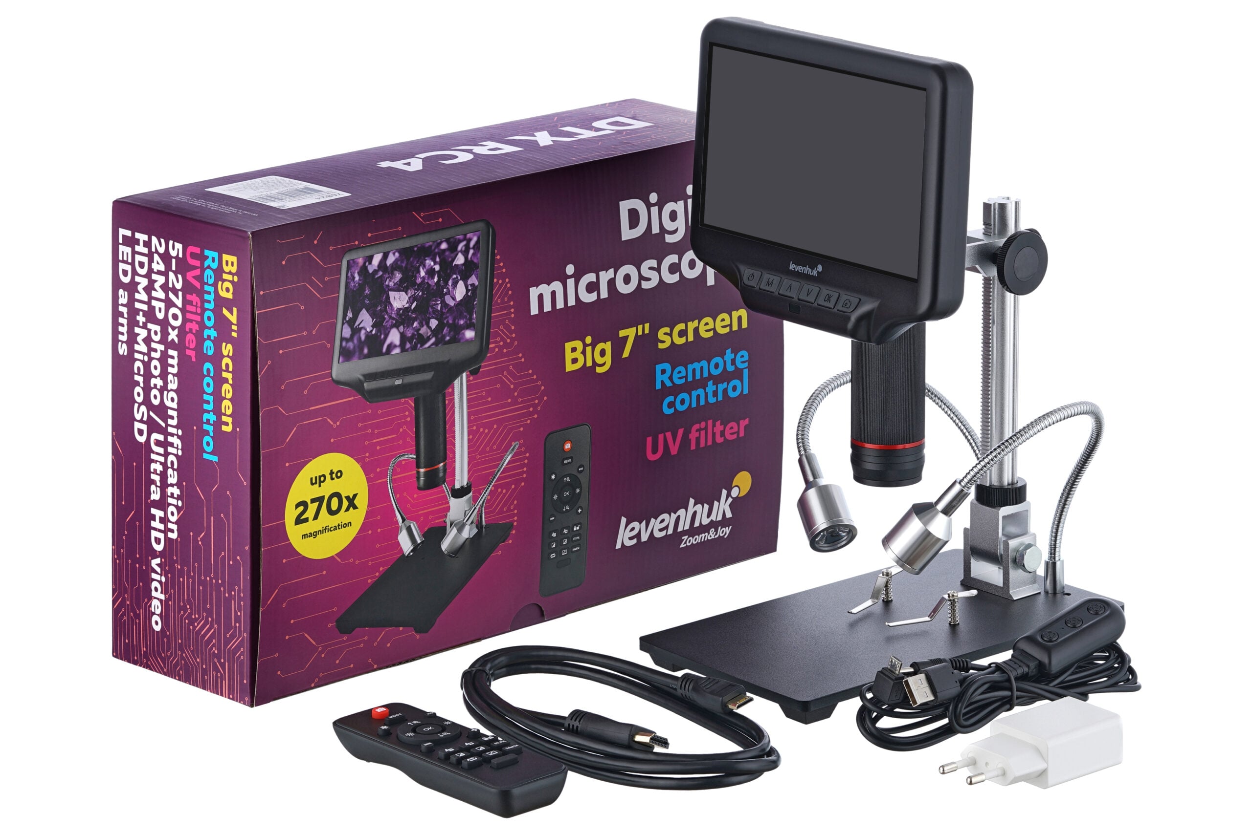 Levenhuk DTX RC4, uzaktan kumandalı, 7" LCD ekranlı dijital mikroskoptur. 5–270x toplam büyütme (optik 5–40x) sunar ve Tam HD (1920×1080) video, yüksek çözünürlüklü fotoğraf çekimine olanak tanır. Esnek kollara sahip iki ayarlanabilir LED spot, elektronik onarım, mücevher inceleme ve teknik numune analizi gibi uygulamalarda kontrollü aydınlatma sağlar. Görüntü HDMI üzerinden harici ekrana aktarılabilir. Kablosuz uzaktan kumanda, büyütme, aydınlatma ve kayıt işlemlerinin temassız yönetimini mümkün kılar. Öne çıkanlar 7" eğilebilir LCD ekran 5–270x büyütme (optik + dijital) Tam HD video, yüksek çözünürlüklü fotoğraf HDMI ile harici ekran desteği Esnek kollu ayarlanabilir LED aydınlatma Kablosuz uzaktan kumanda
