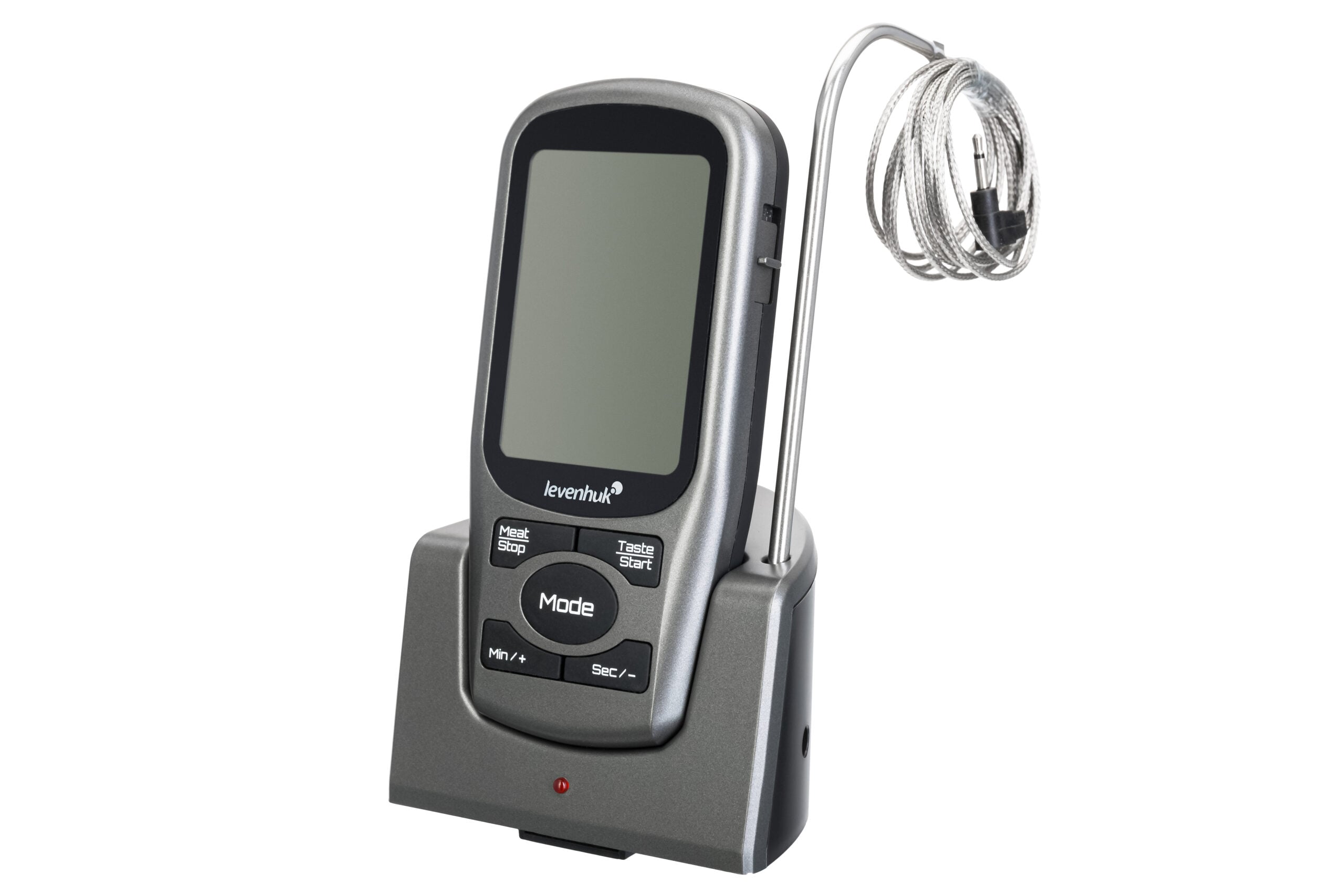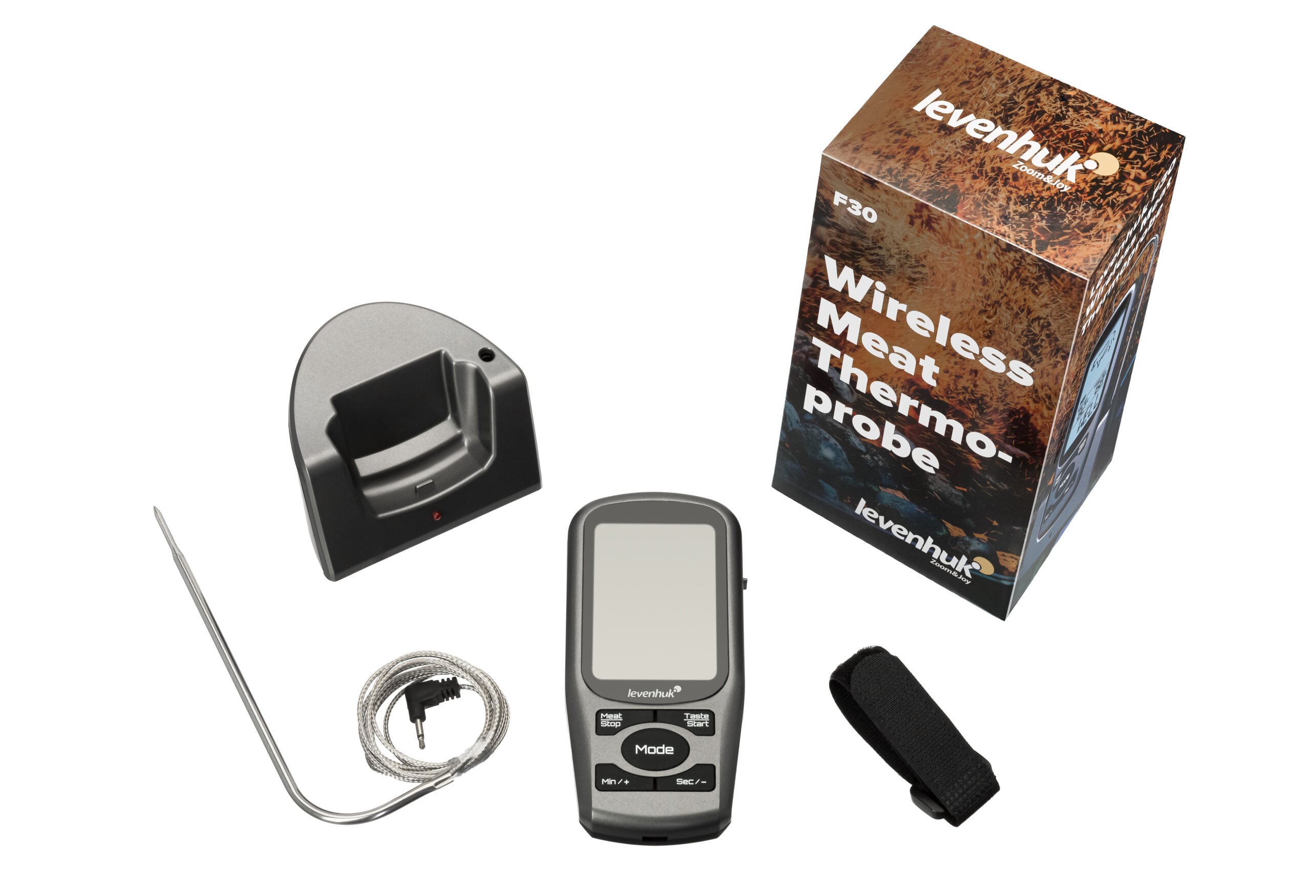 Levenhuk F30, tam olarak etle çalışmak için tasarlanmış kablosuz bir termoprobdur. En ilginç özelliği, et türünü ve pişme derecesini belirleme seçeneğidir. Bu nedenle, fazla çaba harcamadan mükemmel şekilde pişmiş bir yemek elde edebilirsiniz. Cihazda ayrıca bir zamanlayıcı ve sıcaklık sınırını gösteren sesli bildirim işlevi bulunur. Cihaz birkaç bileşenden oluşur: kablolu bir termoprob, bir verici ve bir alıcı. Taban, mutfakta uygun herhangi bir yere kurulabilir, örn. Velcro veya bir mıknatıs kullanılarak fırın kapağına takılabilir. Termoprob bir kablo ile ona bağlanır. Alıcı, doğrudan tabana veya başka herhangi bir alana yerleştirilebilir. Alıcı, tüm prob ölçümlerini ve diğer faydalı bilgileri gösteren bir ekrana sahiptir. Ayrıca çalışma modlarını ayarlamak için de kullanılır. Termo prob sadece bir mutfak aleti değildir, aynı zamanda iç veya dış mekan sıcaklığını kontrol etmek için standart bir termometrenin yerini alabilir. Probu suya batırırsanız, su sıcaklığını ölçer ve sıcaklığın banyo yapmak için uygun olduğunu size bildirir. Bahçecilikle uğraşanlar için, toprak sıcaklığını ölçmeye yönelik bir termo prob kullanışlı olacaktır. Ayrıca tıbbi bir termometre olarak kullanılabilir, çay demleme sürecini kontrol etmeye yardımcı olur, portatif bir soğutucu çantada sıcaklığı ölçer ve çok daha fazlasını yapar. Taban ve alıcı standart pillerle çalışır. Önemli özellikler: