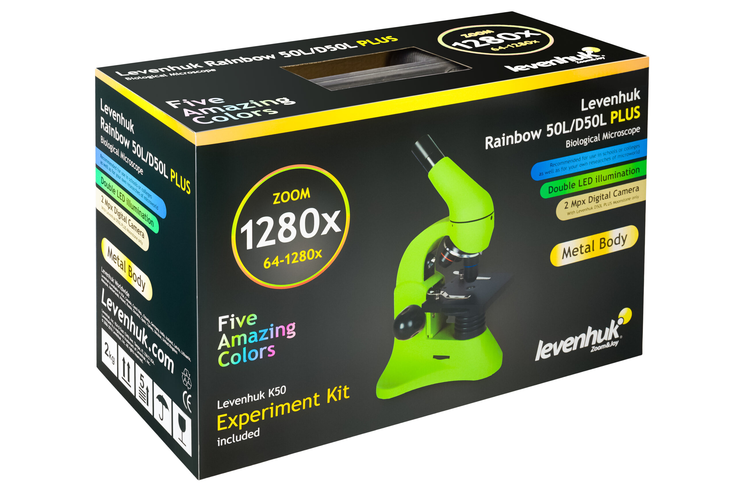 Levenhuk Rainbow 50L PLUS, 64–1280x büyütme sunan, metal gövdeli ve Barlow mercekli bir biyolojik mikroskoptur. 4x, 10x ve yaylı 40xs objektif ile WF16x göz merceği ve 2x Barlow, yüksek büyütmede slayt güvenliği ve daha ayrıntılı gözlem sağlar. Üst ve alt LED aydınlatma, saydam, yarı saydam ve opak numunelerin incelenmesine olanak tanır. 45° eğimli ve 360° dönebilen monoküler başlık, eğitim ve grup çalışmaları için uygundur. Levenhuk K50 Deney Seti ve plastik taşıma çantası kutuya dahildir. Öne çıkanlar 64–1280x optik büyütme (2x Barlow dahil) Yaylı 40xs objektif (slayt koruması) Üst ve alt LED aydınlatma, parlaklık ayarı Dayanıklı metal gövde 360° dönebilen, 45° eğimli monoküler başlık Levenhuk K50 Deney Seti ve plastik çanta AC adaptör veya pille çalışma