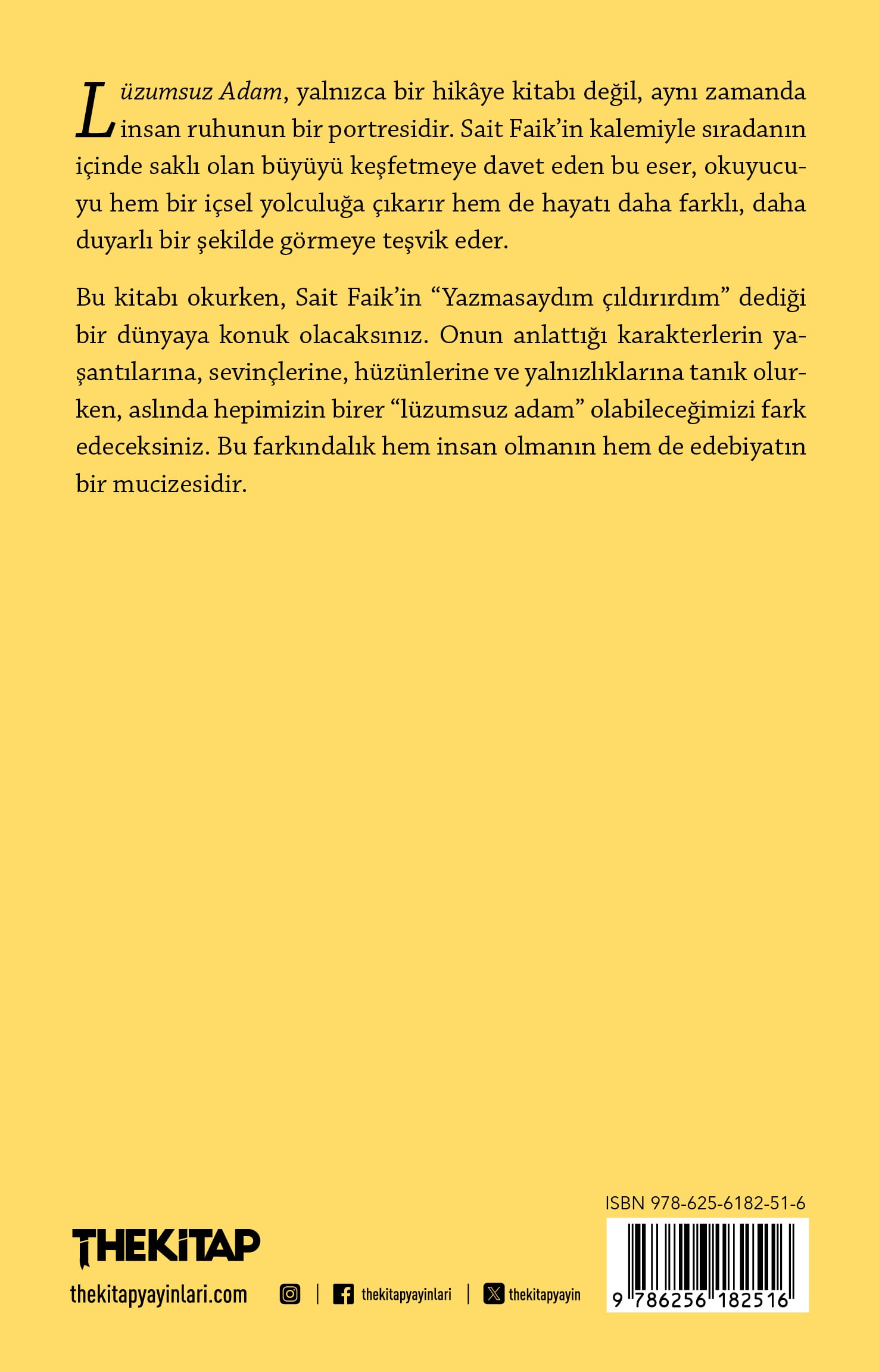 Lüzumsuz Adam, yalnızca bir hikâye kitabı değil, aynı zamanda insan ruhunun bir portresidir. Sait Faik’in kalemiyle sıradanın içinde saklı olan büyüyü keşfetmeye davet eden bu eser, okuyucuyu hem bir içsel yolculuğa çıkarır hem de hayatı daha farklı, daha duyarlı bir şekilde görmeye teşvik eder. Bu kitabı okurken, Sait Faik’in “Yazmasaydım çıldırırdım” dediği bir dünyaya konuk olacaksınız. Onun anlattığı karakterlerin yaşantılarına, sevinçlerine, hüzünlerine ve yalnızlıklarına tanık olurken, aslında hepimizin birer “lüzumsuz adam” olabileceğimizi fark edeceksiniz. Bu farkındalık hem insan olmanın hem de edebiyatın bir mucizesidir.
