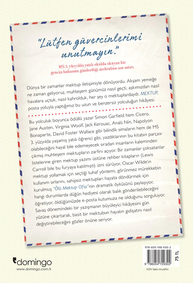 Yolculuk boyunca hem Cicero, Jane Austen, Virginia Woolf, Jack Kerouac, Anaïs Nin, Napolyon Bonaparte, David Foster Wallace gibi bilindik simaların hem de MS 3. yüzyılda yaşamış yatılı öğrenci gibi, yazdıklarının bu kitabın parçası olabileceğini hayal bile edemeyecek sıradan insanların kaleminden çıkmış muhteşem mektupların zarfını açıyor. Bir zamanlar çoksatanlar listelerine giren mektup yazımı üstüne rehber kitapların (Lewis Carroll bile bu furyaya katılmıştı) izini sürüyor, Oscar Wilde’ın mektup yollamak için seçtiği tuhaf yöntemi, görünmez mürekkebin kullanım sırlarını, sahipsiz mektupları hayata döndürmek için kurulmuş ”Ölü Mektup Ofisi”nin dramatik öyküsünü paylaşıyor, hangi durumlarda düğün hediyesi olarak balık gönderilebileceğini öğretiyor, öldüğümüzde e-posta kutumuza ne olduğunu sorguluyor. Savaş dönemindeki bir yazışmanın büyüleyici hikâyesini gün yüzüne çıkartarak, basit bir mektubun hayatın gidişatını nasıl değiştirebileceğini gözler önüne seriyor.