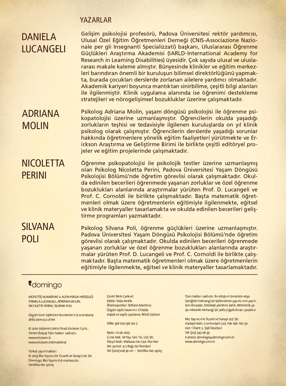 1 hırsızlık olayı, 6 şüpheli ve tek suçlu! İlkokul öğrencilerinin sayısal zekâ becerilerini geliştirmek için hazırlanmış etkinlikli ve çıkartmalı dedektiflik çizgi romanı. Müfettiş Numeroni ile yardımcıları Kenar Mahalle Fareleri, gizemli bir şekilde ortadan kaybolan altın peruğun peşine düşüyorlar. Sevimli dostlarımızla birlikte ipuçlarını ortaya çıkarmaya ve suçluyu bulmaya hazır mısın? Müfettiş Numeroni’ye yardım etmek için önce merak uyandıran mantık oyunlarını çözmemiz gerek. Bunu yaparken aşağıdaki bilgi ve becerileri kullanacağız: • 1’den 100’e kadar sayıların okunuşu, yazılışı; tane ve deste • zihinden hızlı dört işlem • tablo yorumlama • labirentler ve geometrik şekiller • ölçüler: ağırlık, yükseklik, hacim • veri toplama ve örüntü bulma • problem çözme Bulmacalardan ve oyun temelli öğrenmeden ilham alan Müfettiş Numeroni serisi, merak uyandırıcı bir hikâye aracılığıyla, ilkokul 2. ve 3. sınıf öğrencilerinin matematik öğrenimine yardımcı olacak zihinsel süreçleri harekete geçirmeyi, ıraksak ve yaratıcı düşünme biçimini geliştirmeyi amaçlıyor.