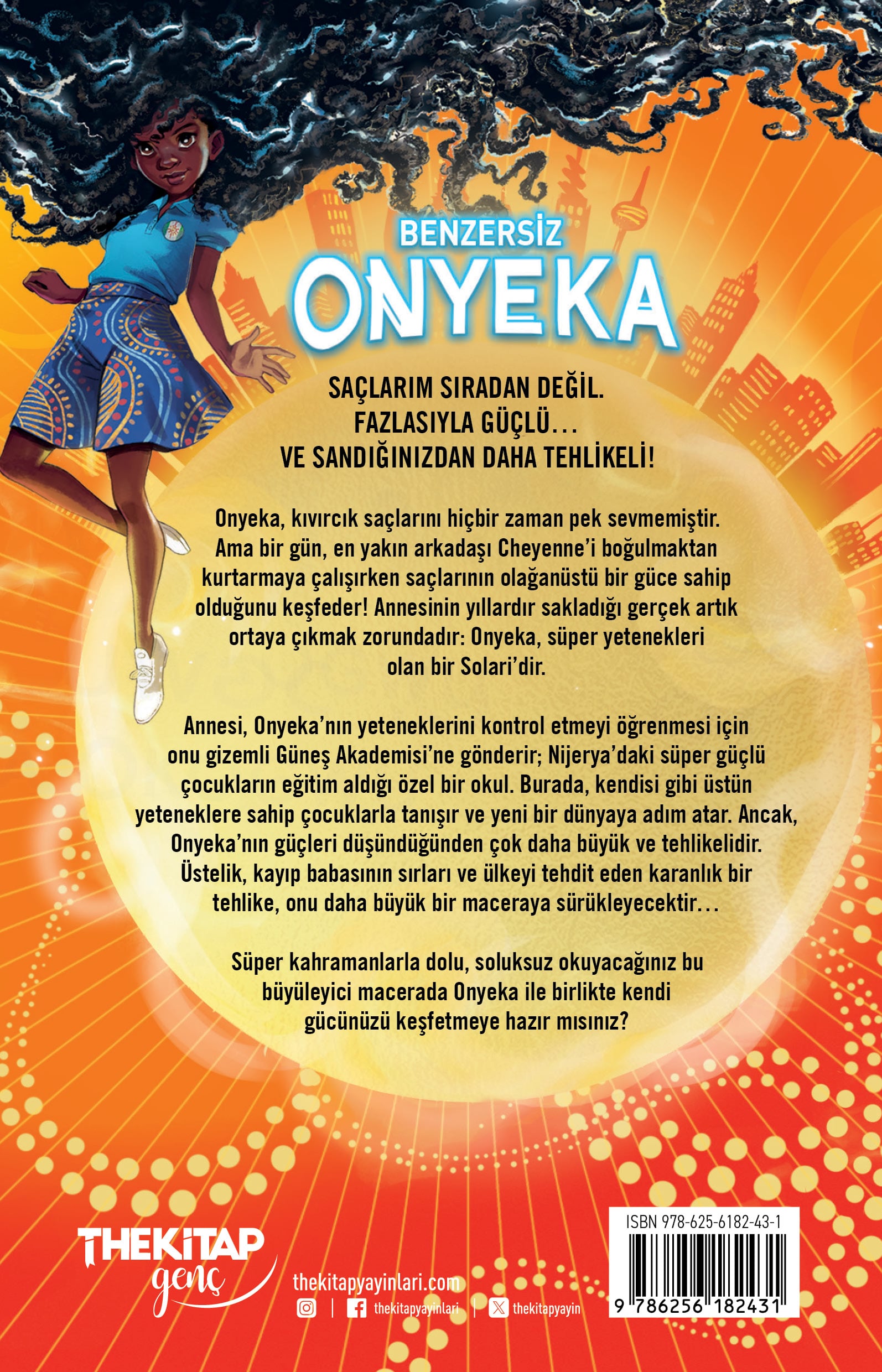 ONYEKA VE GÜNEŞ AKADEMİSİ Saçlarım sıradan değil. Fazlasıyla güçlü… ve sandığınızdan daha tehlikeli! Onyéka, kıvırcık saçlarını hiçbir zaman pek sevmemiştir. Ama bir gün, en yakın arkadaşı Cheyenne’i boğulmaktan kurtarmaya çalışırken saçlarının olağanüstü bir güce sahip olduğunu keşfeder! Annesinin yıllardır sakladığı gerçek artık ortaya çıkmak zorundadır: Onyeka, süper yetenekleri olan bir Solari’dir. Annesi, Onyéka’nın yeteneklerini kontrol etmeyi öğrenmesi için onu gizemli Güneş Akademisi’ne gönderir—Nijerya’daki süper güçlü çocukların eğitim aldığı özel bir okul. Burada, kendisi gibi üstün yeteneklere sahip çocuklarla tanışır ve yeni bir dünyaya adım atar. Ancak, Onyéka’nın güçleri düşündüğünden çok daha büyük ve tehlikelidir. Üstelik, kayıp babasının sırları ve ülkeyi tehdit eden karanlık bir tehlike, onu daha büyük bir maceraya sürükleyecektir…  Süper kahramanlarla dolu, soluksuz okuyacağınız bu büyüleyici macerada Onyéka ile birlikte kendi gücünüzü keşfetmeye hazır mısınız?