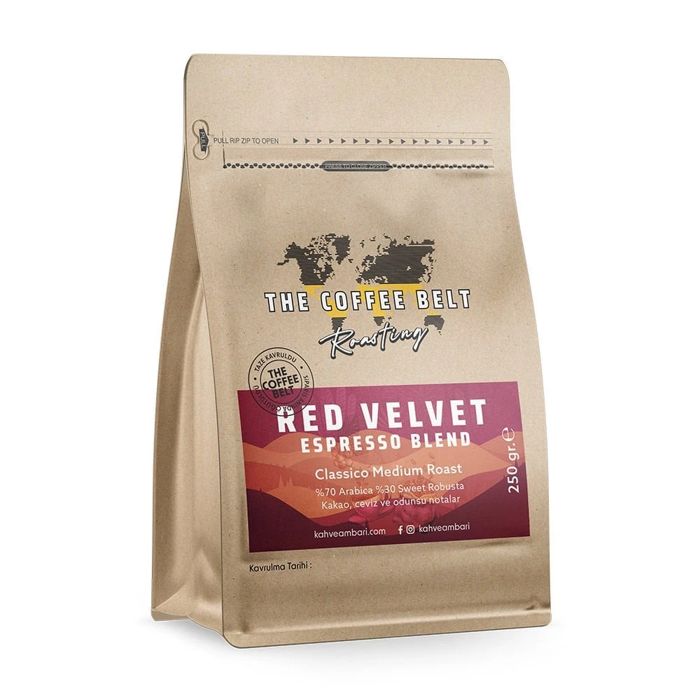 The Coffee Belt Red Velvet Espresso Blend Kahve 250 gr. Red Velvet filtre kahveyi Güney Amerika'nın aromatik Arabica çekirdekleri ve bir miktar tatlı Indian AA Cherry Robusta ile harmanladık. İsminin anlamı "Kırmızı Kadife" gibi yumuşak ve pürüzsüz bir kahve ortaya çıkarttık. Red Velvet...