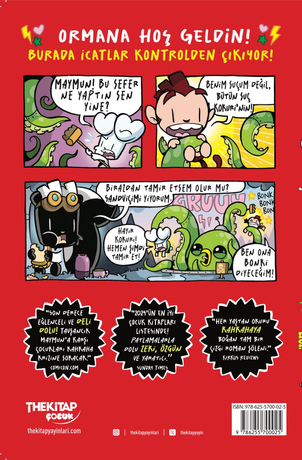 Tavşancık Maymuna Karşı – 3. Kitap Raflarda! Dünya çocuklarının favorisi Türkiye’de! İngiltere’de 1 milyondan fazla sattı, Amazon ve Waterstones listelerinde zirveye çıktı, Avustralya ve İrlanda’da çok satanlar oldu, Amerika’da yükselişe geçti… Şimdi Türkçede, serinin 3. Kitabı ile çocukları kahkahalara boğmaya geliyor! British Book Awards ve LOLies (Laugh Out Loud) Ödülleri’nden dönen bu eğlenceli çizgi roman,çocukların oylarıyla “En Komik Kitap” seçildi. Üstelik Jamie Smart, “Yılın En Komik İllüstratörü” unvanını aldı! Bu kitapta neler mi var? Yaramaz Maymun’un kendini “Ormanın Kralı” ilan etmesi, Tavşancık, Minnak, Pinki, Kokuri ve Tilki Tofi’nin absürt maceraları, dondurma canavarları, robotlar, ışın tabancaları, çılgın icatlar ve bitmeyen kahkaha! Bu seri okumayı eğlenceli hale getiriyor, hayal gücünü coşturuyor, mizah anlayışını geliştiriyor, arkadaşlık ve dayanışma değerlerini kahkaha dolu bir şekilde anlatıyor. Hadi, Tavşancık’ın çılgın dünyasına atlayın! Tavşancık ve Maymun serisi, sadece çocukları değil aileleri de kahkahalara boğuyor. Çocuklar, çocukluğu bırakmayanlar ve çocuklarla birlikte eğlenmek isteyenler bu seriyi kaçırmıyor.