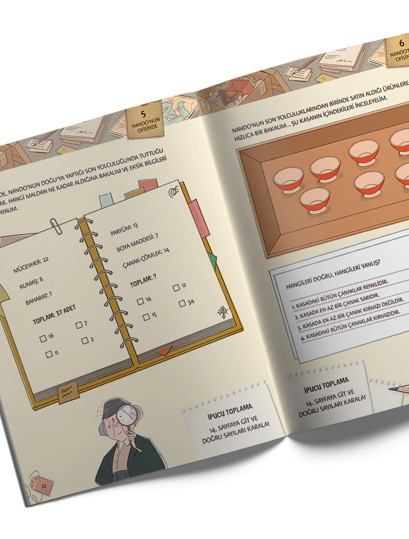İLKOKUL ÖĞRENCİLERİNİN GÖRSEL VE MANTIKSAL BECERİLERİNİ GELİŞTİRMEK İÇİN HAZIRLANMIŞ ETKİNLİKLİ VE ÇIKARTMALI POLİSİYE ÇİZGİ ROMAN Teresa Hala’ya ipuçlarını toplamasında yardım edelim ve neler olduğunu öğrenelim! Ama bunun için önce şu merak uyandıran mantık oyunlarını çözmemiz gerek: • denkleml...