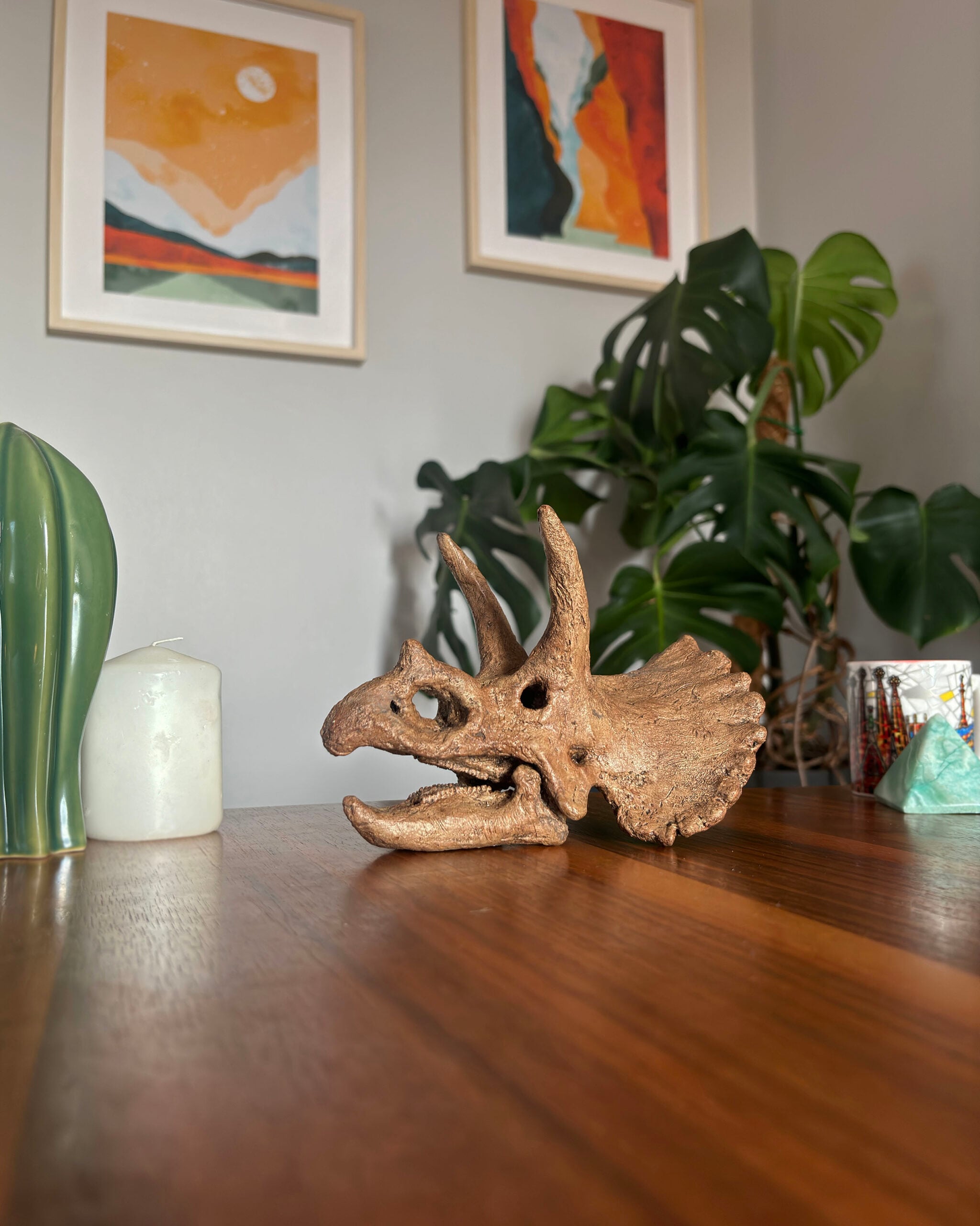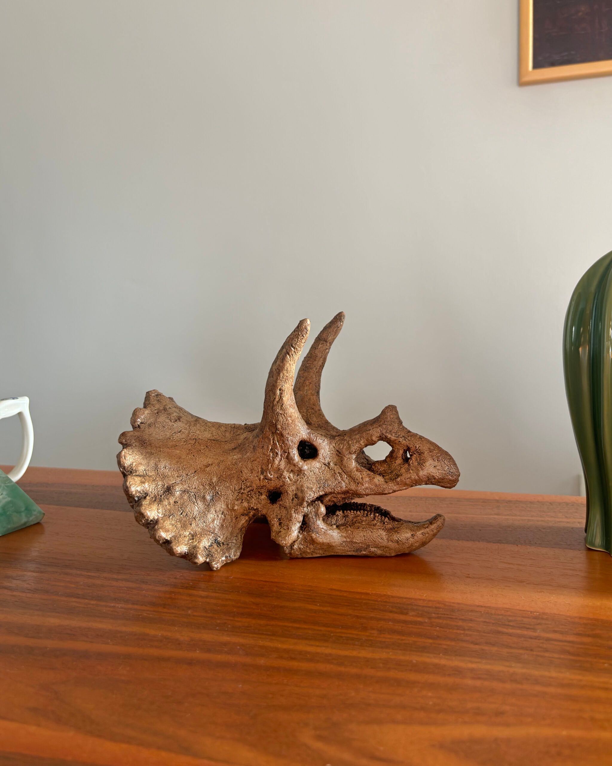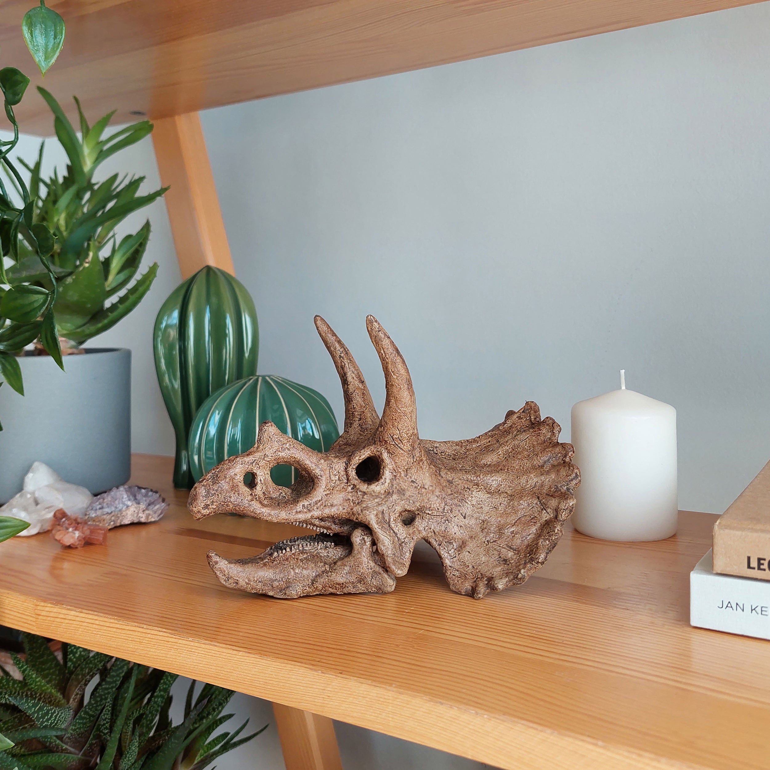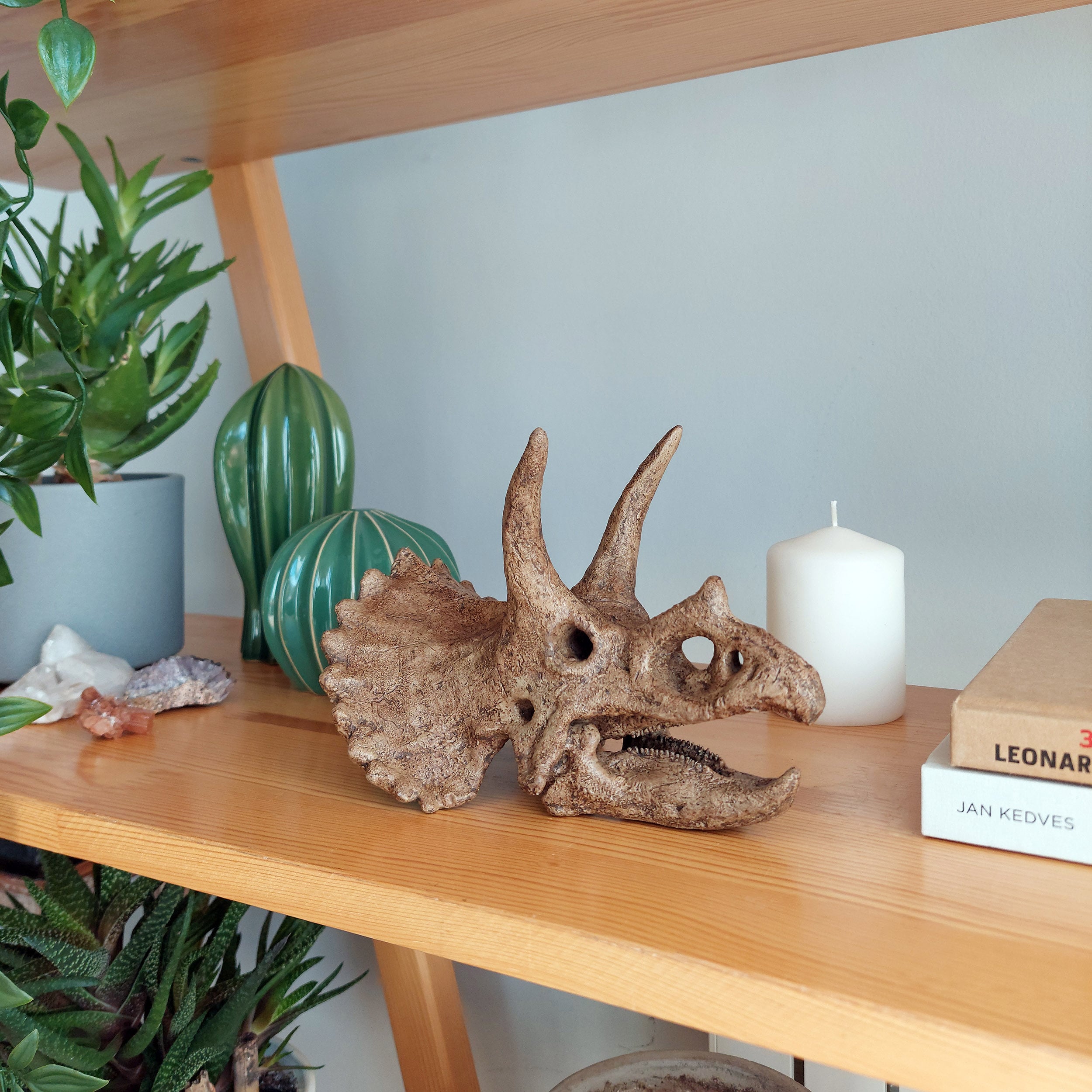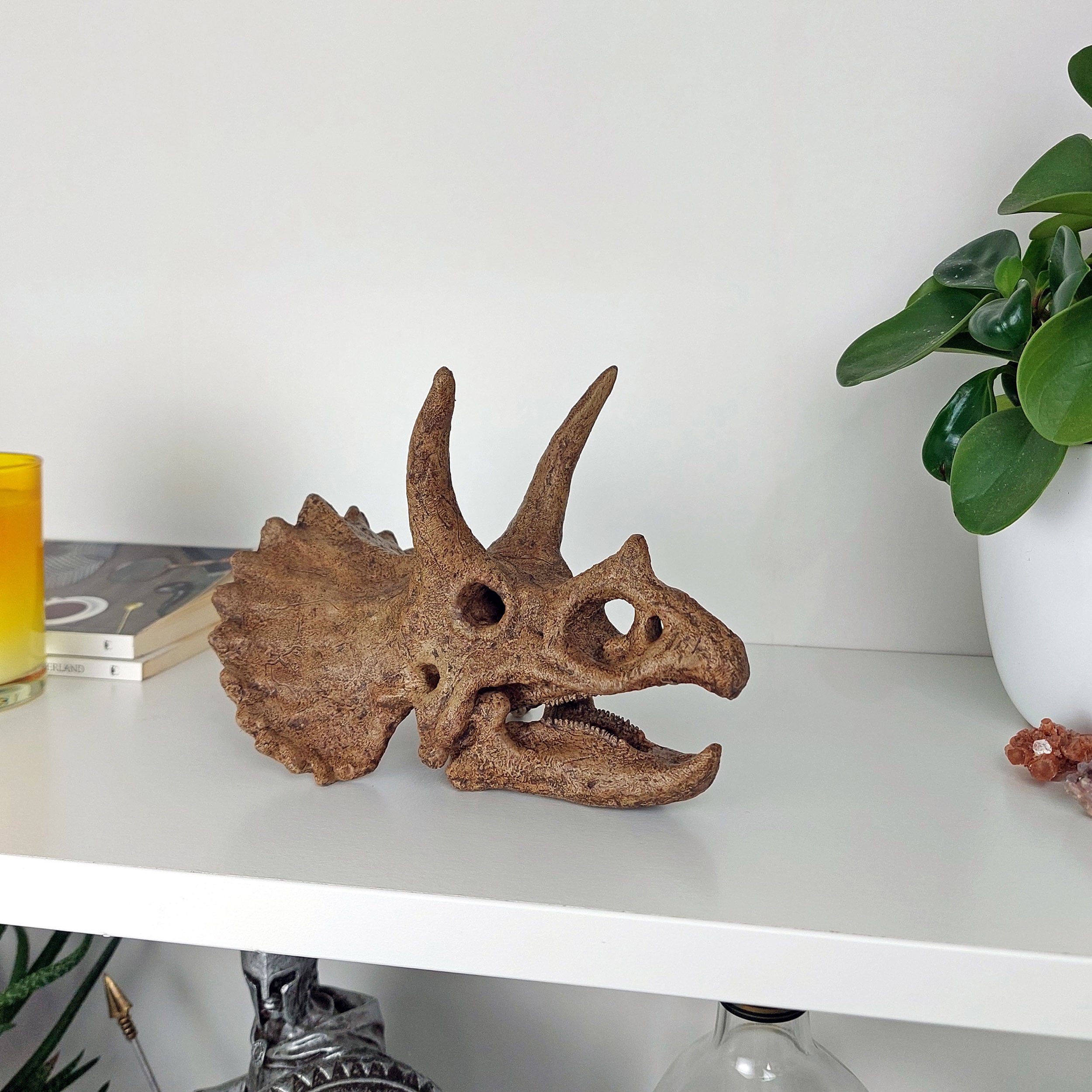 Bu etkileyici canlılar Geç Kretase döneminde (68-66 milyon yıl önce) Kuzey Amerika'da yaşadılar ve fosil kalıntıları 1887 yılında Denver, Colorado'da bulundu. Otobur bir dinozor cinsi olan Triceratops 8–9 metre uzunluğa, 3 metre yüksekliğe, 6-12 ton ağırlığa erişebilirdi. İsmi; Antik Yunanca tri (üç), keras (boynuz) ve ops (yüz) kelimelerinin birleştirilmesiyle oluşturulmuştur. 3 boynuzu kendisini Tyrannosaurus Rex gibi yırtıcılardan koruyabilmek için evrimleşmiştir. Müze ve bilimsel araştırma kalitesinde hazırlanmış, yetişkin bir Triceratops fosilinin kafatası baz alınıp benzer ölçülerde kil kullanılarak tasarlanan heykel çalışmasıdır. %100 El Yapımıdır. Yetişkin bir Triceratops fosilinin ölçüleri baz alınarak tasarlanmıştır.Polyester, resin ve plastik kullanılmadan üretilmiştir. Malzeme:Kil,Akrilik Boya Ürün Boyutları: 18cm x 13cm x 15 cm Not:Kişiye özel üretim yapıldığı için siparişiniz sonrasında heykel en geç 15 iş günü içerisinde kargoya verilecektir.