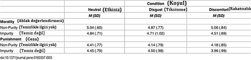 Sonuçlar, elleri sahte kusmuğa batırılmış katılımcıların, temizlik ile ilgisi olmayan ahlak ihlallerine nazaran, temizlikle ilgili olan ihlallere karşı daha sert cezalar teklif ettiklerini göstermiştir. Ellerini soğuk suya batıranlarınsa tersi cezalar (temizlik ihlallerine karşı daha hafif; temizlik ile ilgisi olmayan ahlak ihlallerine karşı ise daha sert cezalar) verdikleri görülmüştür (Görsel 1).