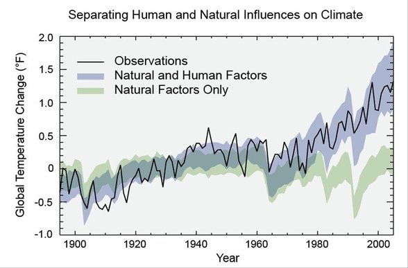 Yapılan bütün analizler, şu anda gözlediğimiz küresel iklim değişiminin sadece doğal mekanizmalarla izah edilemeyeceğini, insan faktörünün tartışmasız bir şekilde ana itici olduğunu göstermektedir. Aşağıdaki grafikte sağ panelde yeşil çizgi, insan etkisi olmasaydı, Dünya'nın sıcaklığını küresel ölçekte etkileyen Güneş ve volkanizma olaylarına bağlı olarak ortalama sıcaklıkların nasıl değişmesini beklediğimizi görmekteyiz.